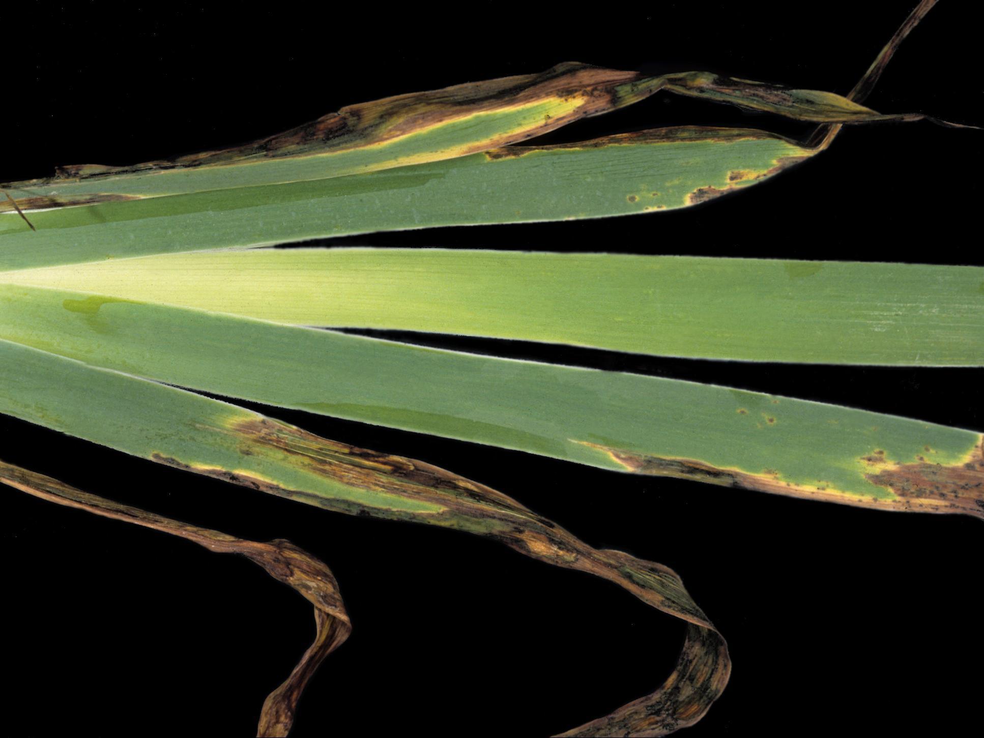 Description: Les feuilles basales et médianes d’un iris présentent des brûlures brunes débutant à l’apex et progressant ensuite à la marge. Un halo jaune entoure les brûlures. Les tests de laboratoire ont révélé la présence de la bactérie Xanthomonas sp., responsable de la tache bactérienne. Chez l’iris des jardins, la bactérie Xanthomonas campestris pv. tardicrescens est rapportée. Le conseiller agricole mentionne que 80 % des 1500 plants d’iris des jardins sont affectés et que la maladie se développe rapidement.
