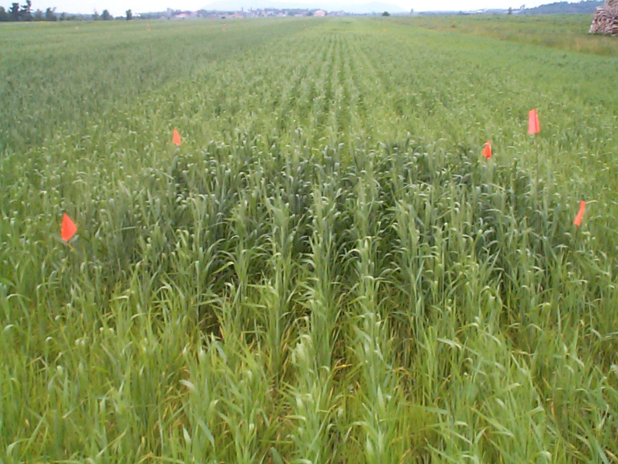 Description: Dans un champ de blé de printemps en production biologique, une parcelle de plants et une zone du champ (à gauche) montrent des plants vert foncé. Le producteur a fait une application inégale de fumier, appliquant de plus fortes doses dans certaines parties du champ. La coloration vert foncé des plants est attribuable à un excès d’azote.