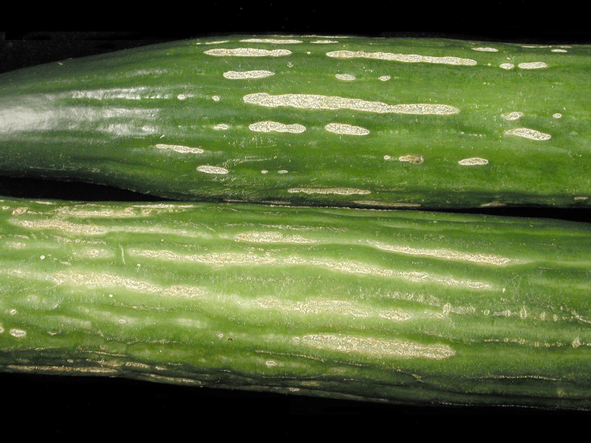 Description: Présence de longues stries subérisées grisâtres à brunâtres disposées longitudinalement tout autour des concombres. Ces lésions peuvent être très courtes soit de quelques millimètres ou atteindre plusieurs centimètres de longueur. L'épiderme environnant les dommages est vert pâle. La chair est sans symptôme (non visible ici). Considérant le type de dommage, le fort pourcentage de plants atteints (80 à 100 %), l'absence de thrips et de dommages aux feuilles et les écarts de température importants survenus dans la serre, il s'agit probablement de la gerçure.