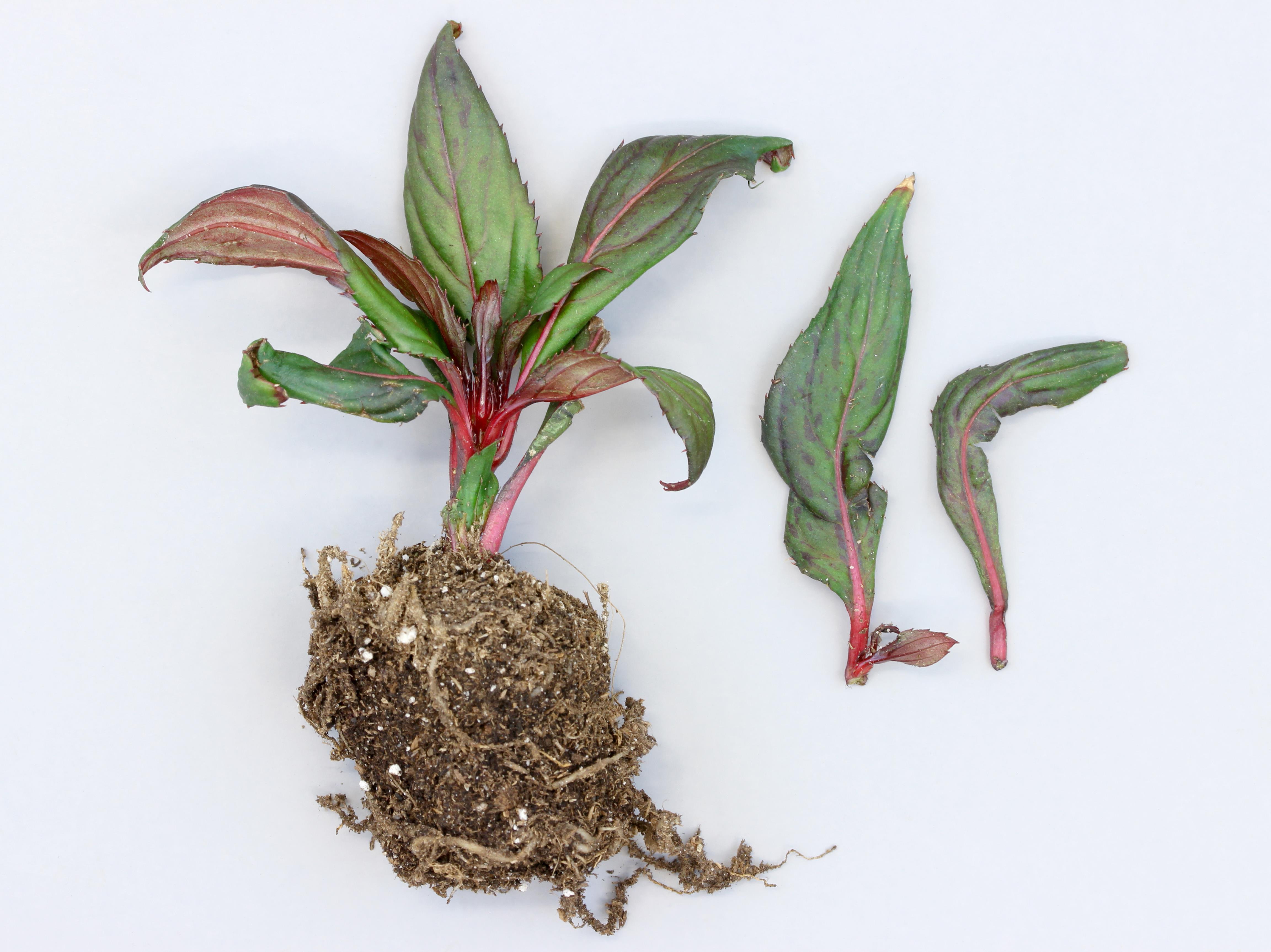 Légende: Déformation et rougissement des feuilles d'un plant d'impatiente