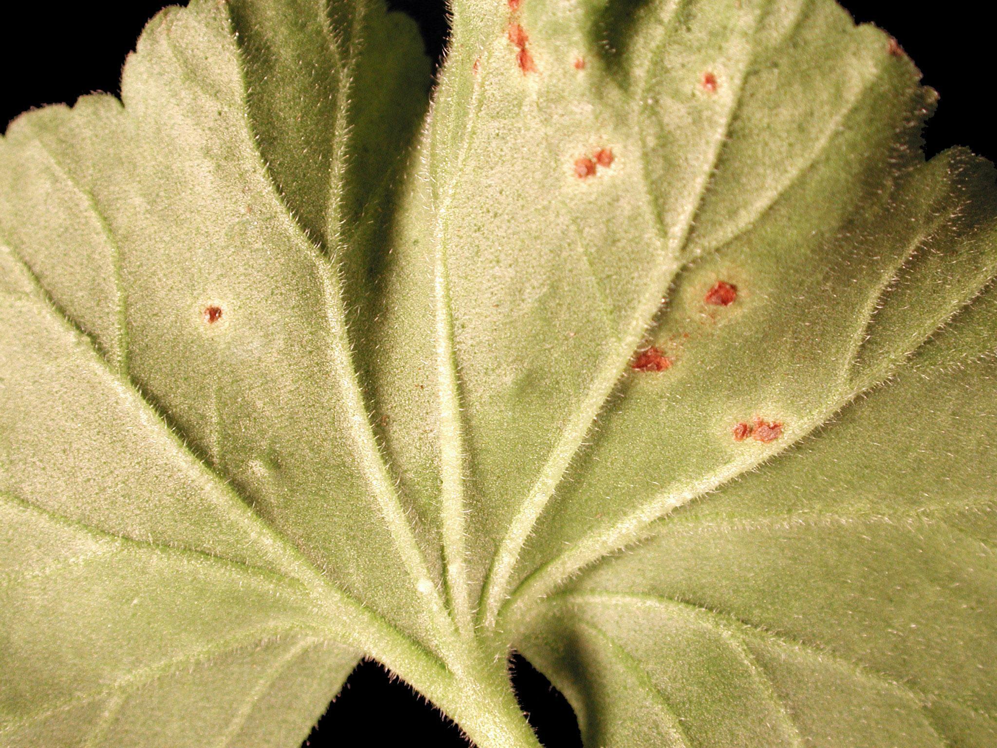 Description: À la face inférieure d’une feuille de géranium, présence de petites taches circulaires vert pâle contenant des pustules (urédies) brunâtres. Les pustules contiennent des urédospores. Vis-à-vis chacune des taches, il y a une tache circulaire vert pâle à jaune à la face supérieure (non visible ici). Les observations microscopiques ont révélé la présence du champignon Puccinia pelargonii-zonalis, responsable de la rouille du géranium. Notez que l'image est légèrement surexposée.