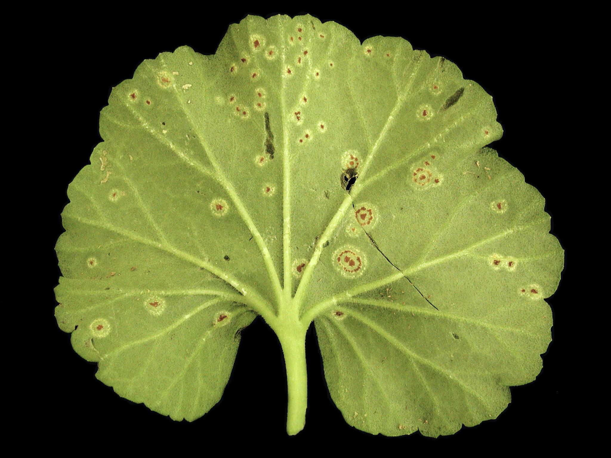 Légende: Taches et pustules sur feuille de géranium