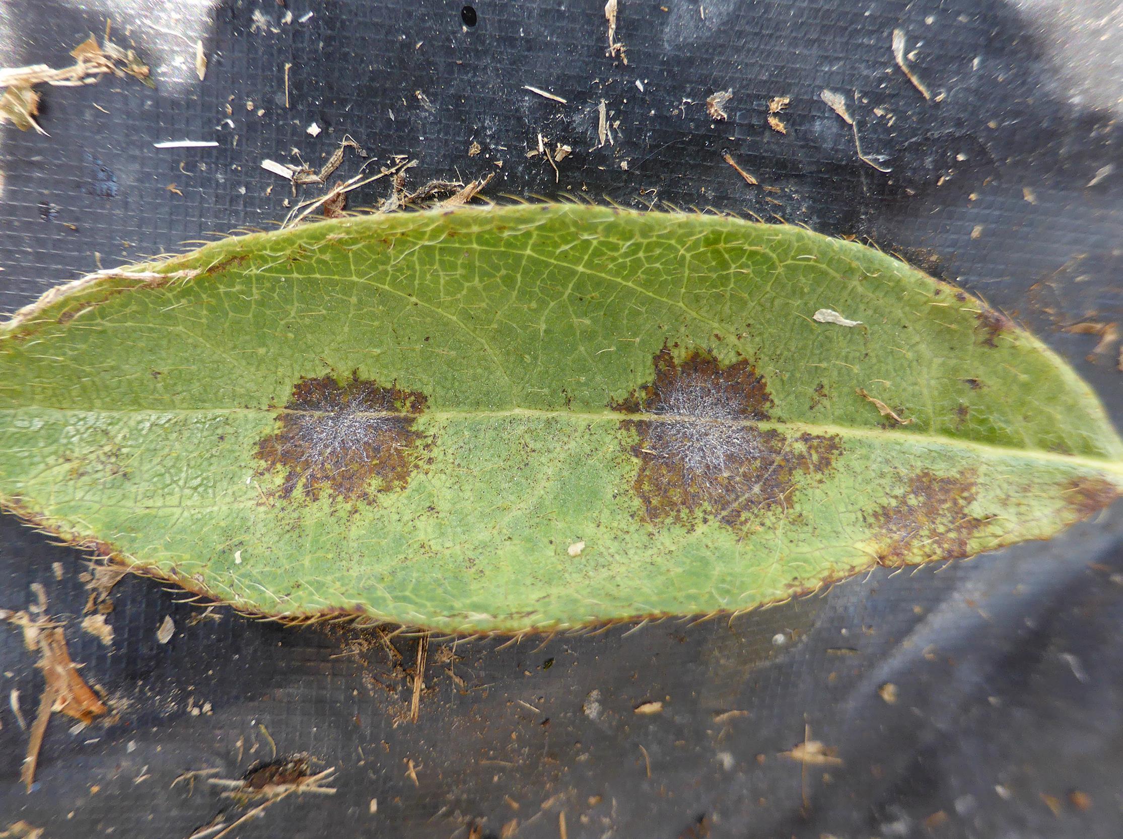 Description: Deux taches duveteuses et circulaires causées par le blanc (Oïdium). Le centre feutré et blanc correspond au mycélium du champignon Erysiphe lonicerae qui croît dans les cellules épidermiques de la feuille et fait progressivement jaunir, puis brunir le limbe.