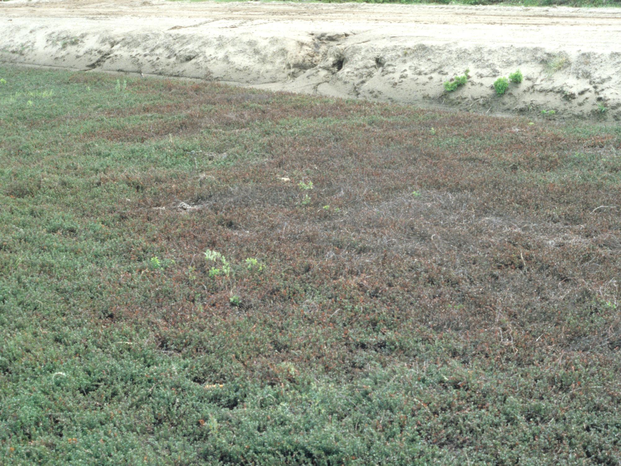 Description: Le feuillage des plants de canneberge est devenu rouge à brun à la suite d’une application printanière de l’herbicide dichlobénil (Casoron). C’est probablement le recoupement des zones traitées, à l’extrémité du champ, qui est à l’origine de ce symptôme.