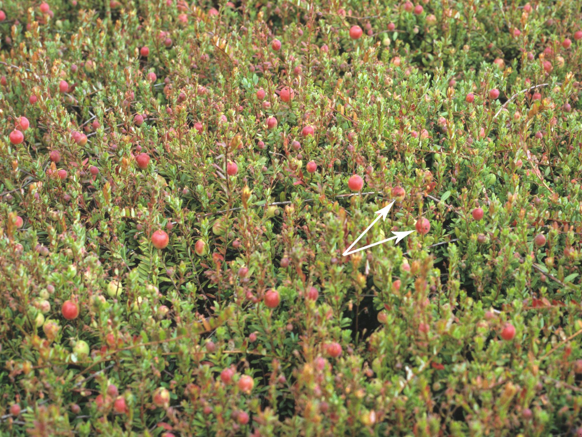 Description: À l’extrémité des tiges de canneberge, présence d’un rougissement à brunissement du feuillage. Les fruits présentent de petites taches noires ou un noircissement de l’épiderme (voir flèches). Ces symptômes sont causés par une phytotoxicité au parathion. Ces symptômes apparaissent au champ lorsque le volume d’eau utilisé lors de l’application est trop faible, ce qui a pour effet de concentrer la matière active.