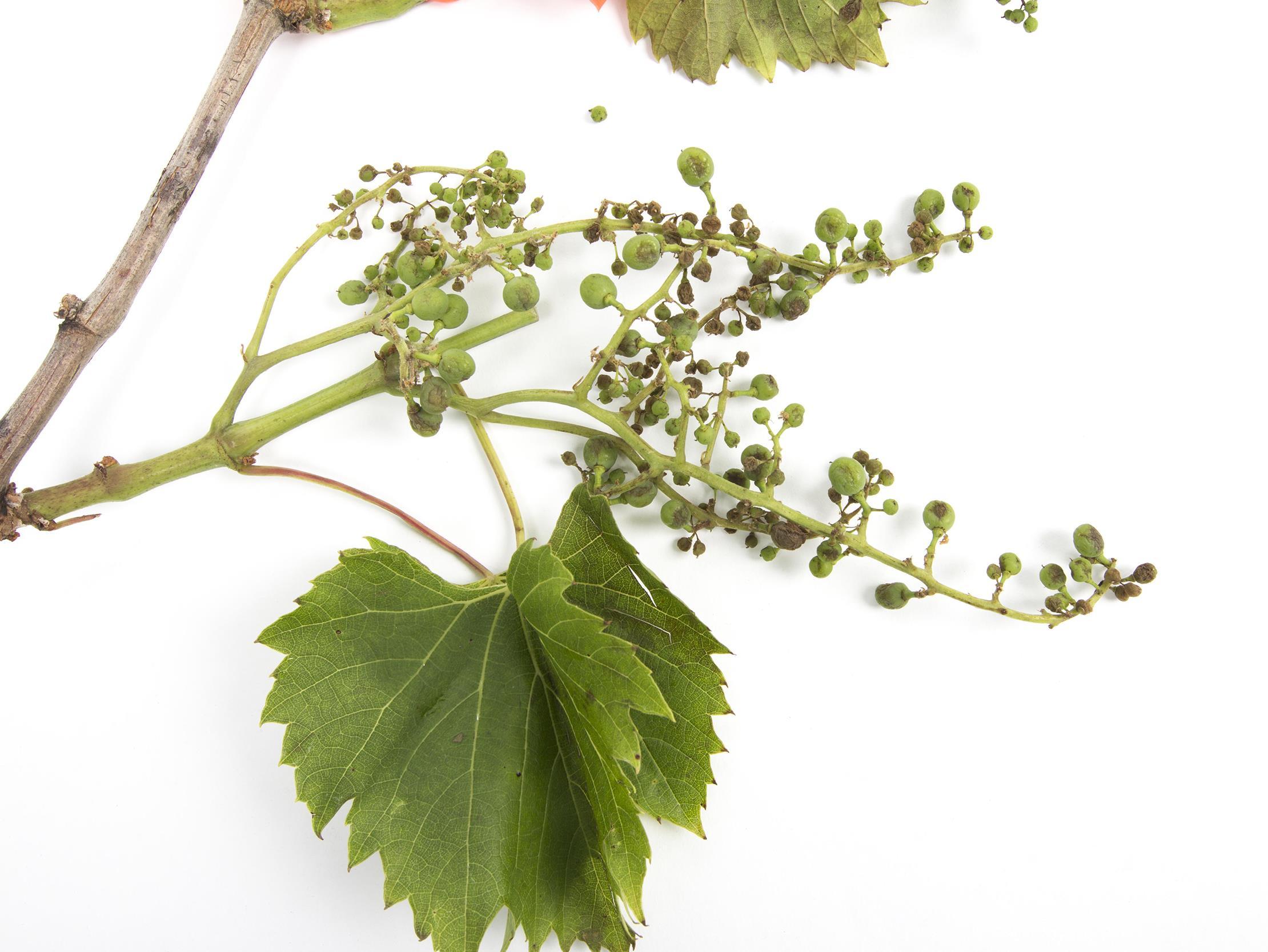 Description: Ces grappes de vigne (cépage Frontenac rouge) sont particulièrement clairsemées ; les fruits sont peu nombreux, de petit calibre et la maturité est inégale. Plusieurs fruits sont bruns, secs et ratatinés. Les tests de laboratoire ont révélé la présence du virus de la tache annulaire de la tomate (ToRSV).