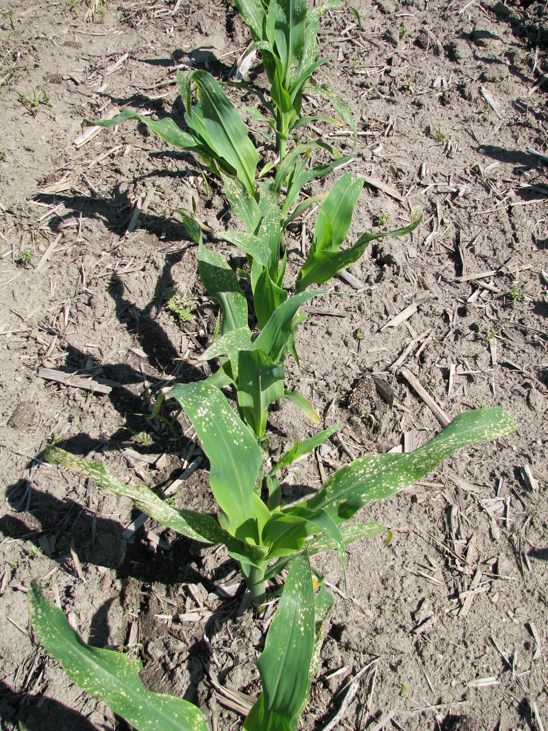 Description: Les feuilles médianes du maïs présentent de petites taches circulaires, réparties sur le limbe à partir de l’apex. Ce symptôme serait attribuable à l’adjuvant présent dans l’herbicide ACCENT TOTAL (nicosulfuron/dicamba/diflufenzopyr), appliqué dans la parcelle de maïs. Ce symptôme survient en particulier lors de conditions de températures élevées, suite à l’application de l’herbicide.