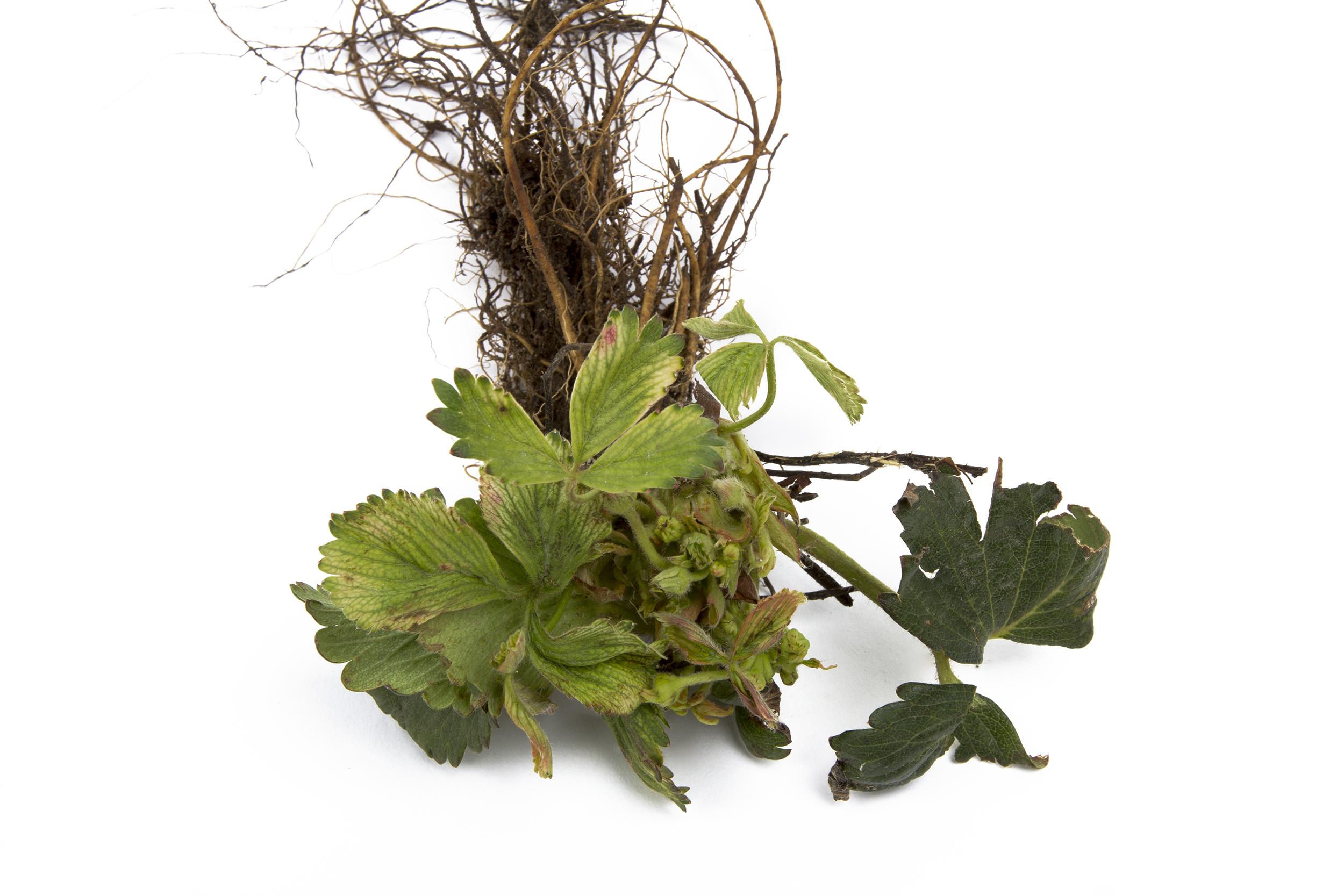 Description: Les feuilles terminales d’un plant de fraisier montrent un jaunissement à blanchiment internervaire, souvent teinté de rose à la marge. Les symptômes sont apparus graduellement sur environ 45 % de la production, selon une distribution en foyer. Les feuilles basales et médianes ne montrent que très peu ou pas de symptôme. Le dosage chimique réalisé sur les plants atteints a révélé la présence de glyphosate dans les tissus végétaux, en quantité suffisante pour causer les symptômes observés. Comme aucun herbicide n’a été appliqué dans la plantation, l’hypothèse est que des lots de paille ayant été traitée au glyphosate en pré-récolte aient été utilisés pour la protection hivernale des fraisiers.