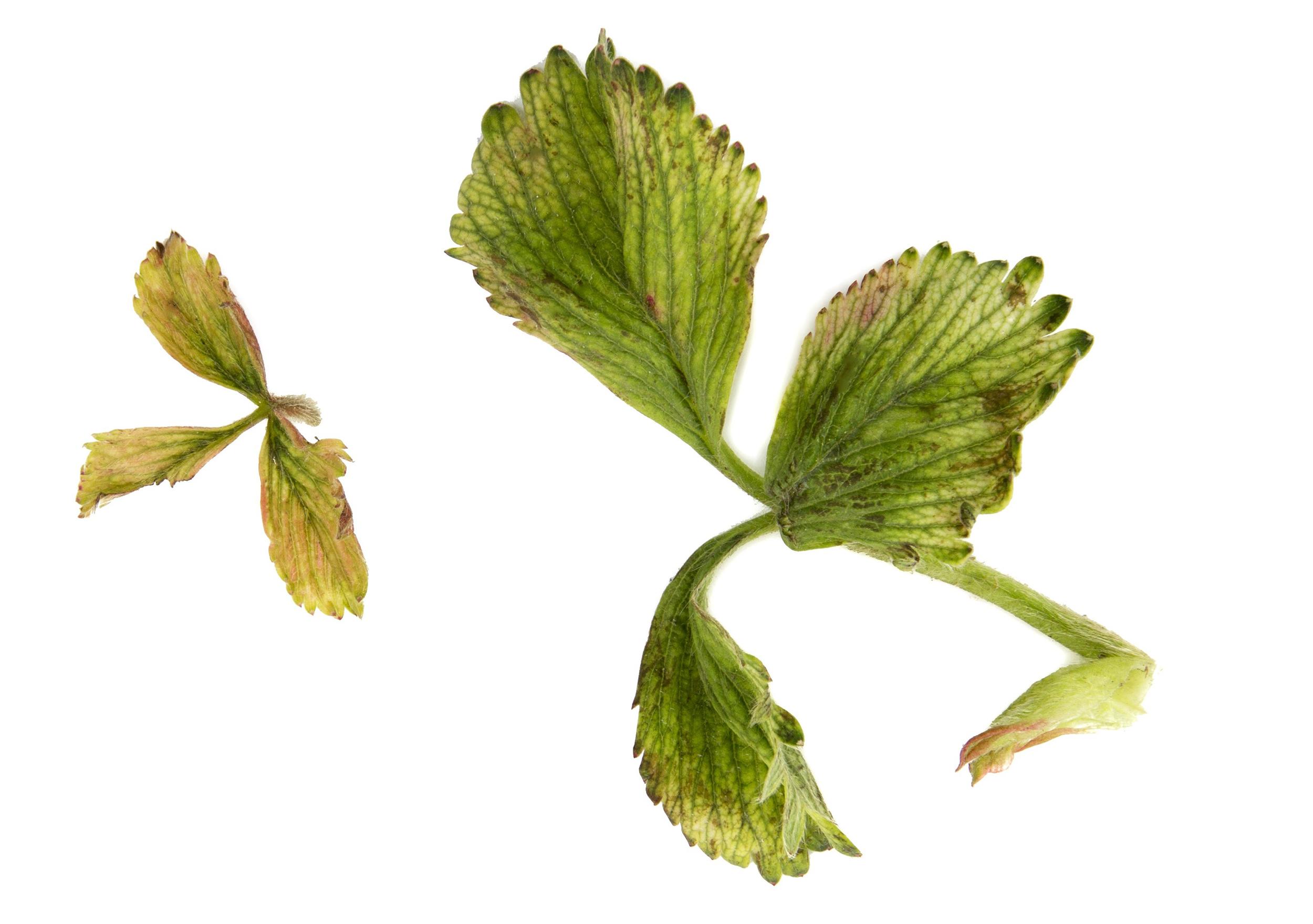 Description: Les feuilles terminales d’un plant de fraisier montrent un jaunissement à blanchiment internervaire, souvent teinté de rose à la marge. Les symptômes sont apparus graduellement sur environ 45 % de la production, selon une distribution en foyer. Les feuilles basales et médianes ne montrent que peu ou pas de symptôme. Le dosage chimique réalisé sur les plants atteints a révélé la présence de glyphosate dans les tissus végétaux, en quantité suffisante pour causer les symptômes observés. Comme aucun herbicide n’a été appliqué dans la plantation, l’hypothèse est que des lots de paille ayant été traitée au glyphosate en pré-récolte aient été utilisés pour la protection hivernale des fraisiers.
