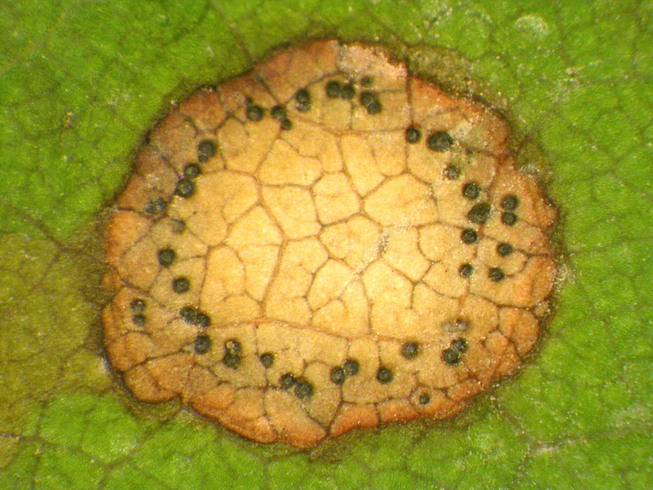 : Disposition circulaire des pycnides de Phyllosticta ampelicida dans la tache foliaire d'une vigne (Stéréomicroscope)
