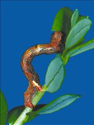 Adulte : chez la femelle, l'envergure des ailes est de 18,0 à 21,0 mm; les ailes antérieures sont beiges avec quelques taches brunes au niveau de la marge antérieure; les ailes postérieures sont blanchâtres; chez le mâle, l'envergure des ailes est de 25,0 à 27,0 mm; elles sont immaculées, gris ardoise, et la marge des ailes antérieures présente une bande foncée. L'arpenteuse noire est une espèce très vorace qui s'attaque principalement aux bourgeons des plants de canneberge au printemps. Des sections entières de champs peuvent être partiellement défoliées par ce ravageur. Au moment de la floraison, on peut observer l'apparition de zones plus foncées à cause d'un manque de feuillage. L'arpenteuse noire produit une génération par année ...