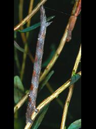 Adulte : envergure des ailes de 22,0 à 30,0 mm; les ailes antérieures et postérieures sont gris clair et présentent une ligne postmédiane foncée très sinueuse et adjacente à une bande brun roux; une tache brun foncé avec un centre gris pâle est visible au milieu des ailes antérieures; la marge des ailes présente une ligne formant des demi-cercles. Iridopsis ephyraria s'attaque occasionnellement aux plants de canneberge. Elle est toutefois considérée comme étant un ravageur mineur dans cette culture. L'arpenteuse à taches produit une génération par année. Cette espèce hiberne au stade d'oeuf. Les larves sont actives de juin à juillet. Les adultes sont actifs de juillet à août. Jeune larve sur une tige de canneberge (tête à gauche) ...