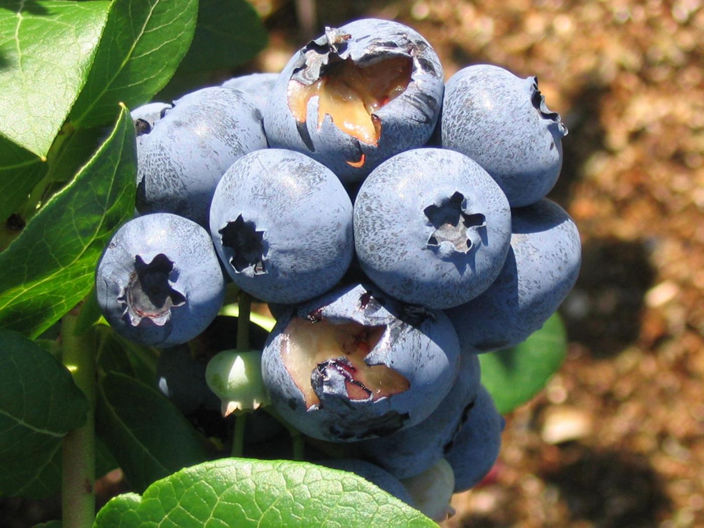 : Sur des bleuets en corymbe, présence de blessures d’une forme angulaire sur l’épiderme et dans la chair. Ces dégâts sont causés par des oiseaux.
