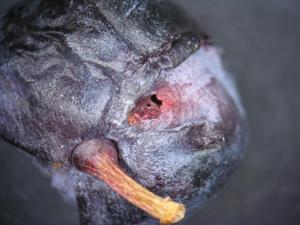 Sur des bleuets en corymbe, présence de blessures d’une forme angulaire sur l’épiderme et dans la chair. Ces dégâts sont causés par des oiseaux.
