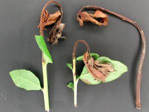 Sur une tige de bleuet en corymbe, présence de brûlures humides des feuilles et des fleurs. L’extrémité de la tige présente également des zones de chancres brunâtres. Les test...