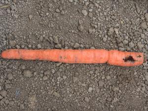 Lors des premières récoltes au champ, présence d’une courte fente longitudinale dans la partie supérieure d’une carotte, près du collet. La chair autour de la fente est subéri...