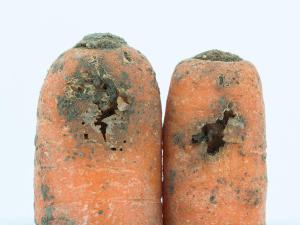 En entrepôt, les racines de carotte (cv 'Cheyenne') montrent une pourriture brune, plutôt ferme, déprimée et mesurant entre 1 et 2 cm. Les tests de laboratoire ont révélé la p...