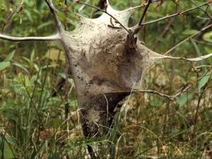 Tente de soie tissée par des larves de la livrée d'Amérique : les chenilles de Malacosoma americanum construisent de grandes tentes de soie, principalement pour se mettre à ...