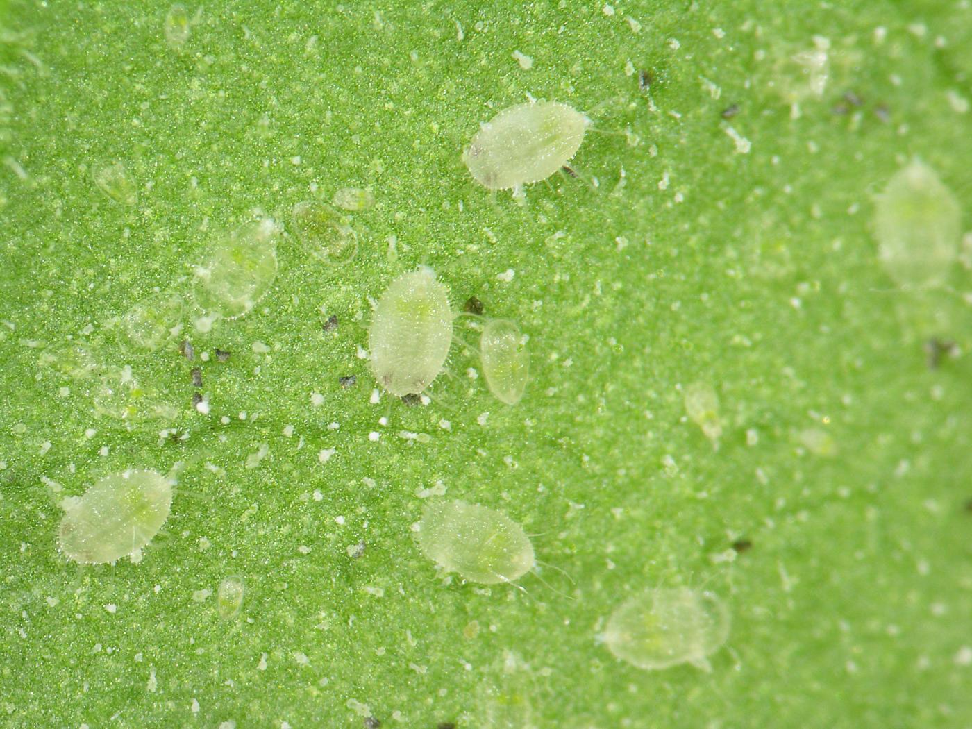 Oeuf : 0,24 mm de long par 0,07 mm de large; il est de forme ovoïde avec un pédicelle (petite projection en forme de tige) à la base; de couleur verte et recouvert d’une cire blanche à la ponte, il devient brun foncé à maturité.