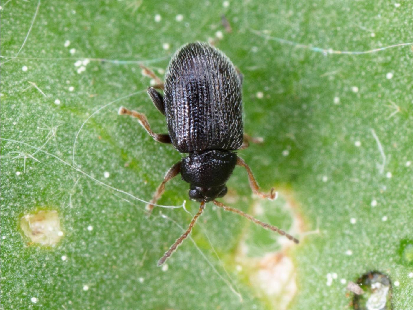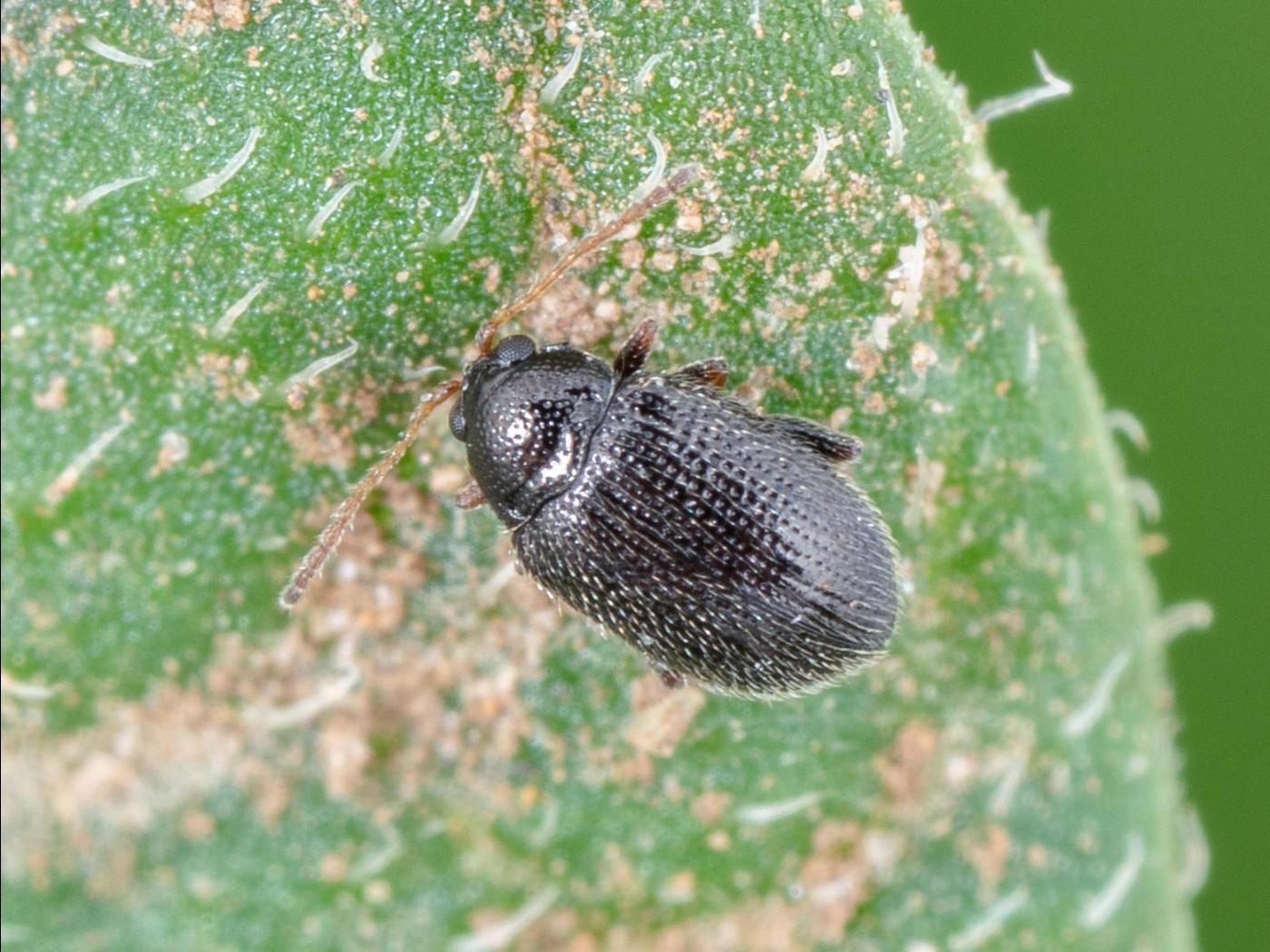 Adulte : 1,5 à 2,0 mm; le corps est noir et les élytres sont recouverts d’une fine pilosité blanchâtre; les antennes et les pattes sont brun pâle.