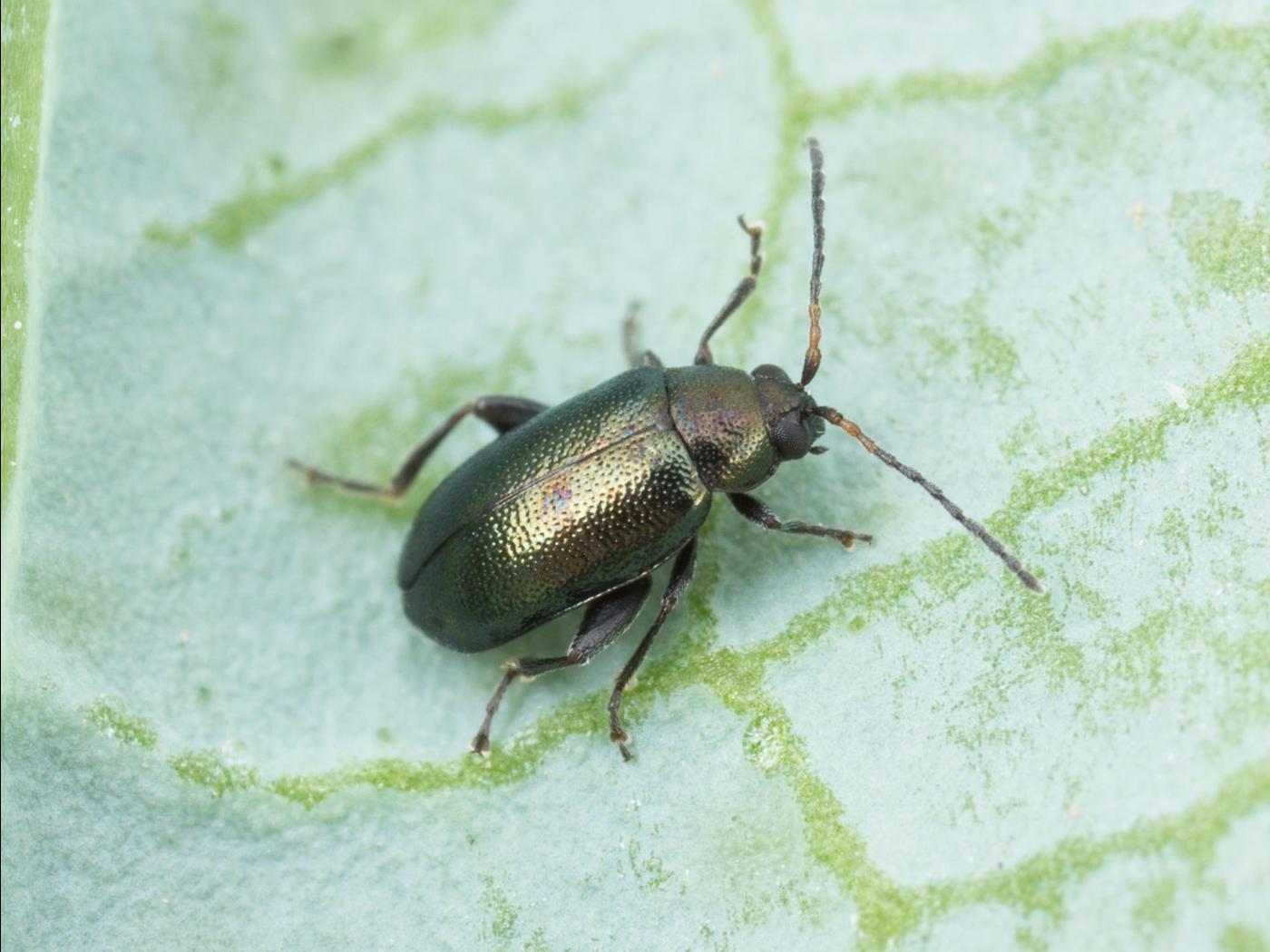 Légende: Plusieurs adultes d'altise des crucifères sur une feuille de chou frisé