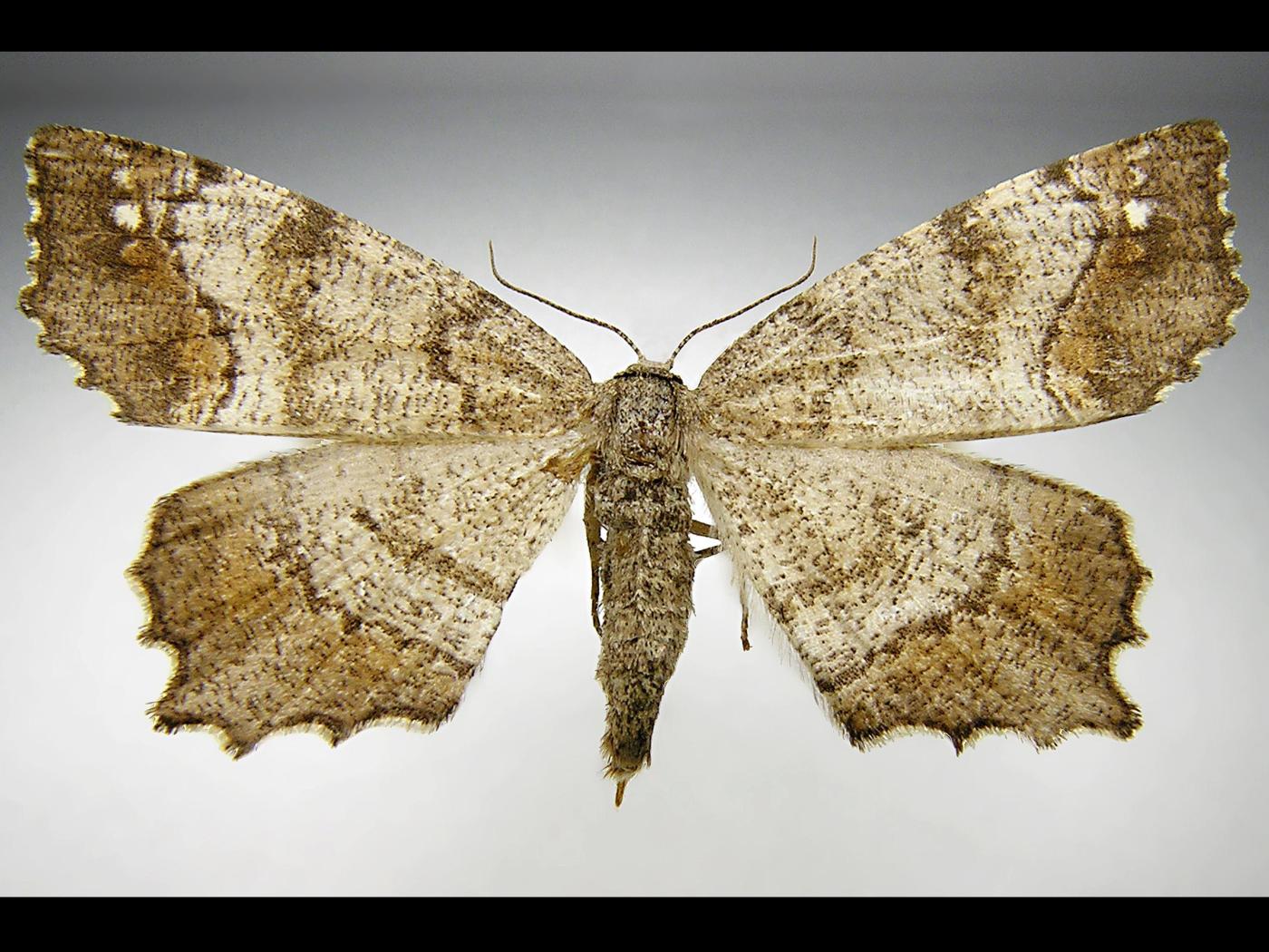 Adulte : envergure des ailes des femelles de 38,0 à 40,0 mm; envergure des ailes des mâles de 30,0 à 32,0 mm; le corps est gris cendré; les ailes sont grises à la base et brunes à la partie distale; l'aile postérieure présente une bande foncée dans les régions médiane et postmédiane; les marges des ailes sont dentelées.