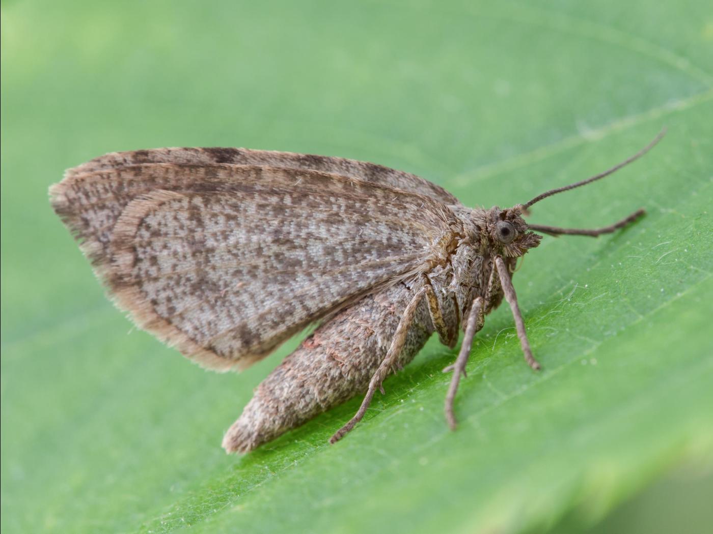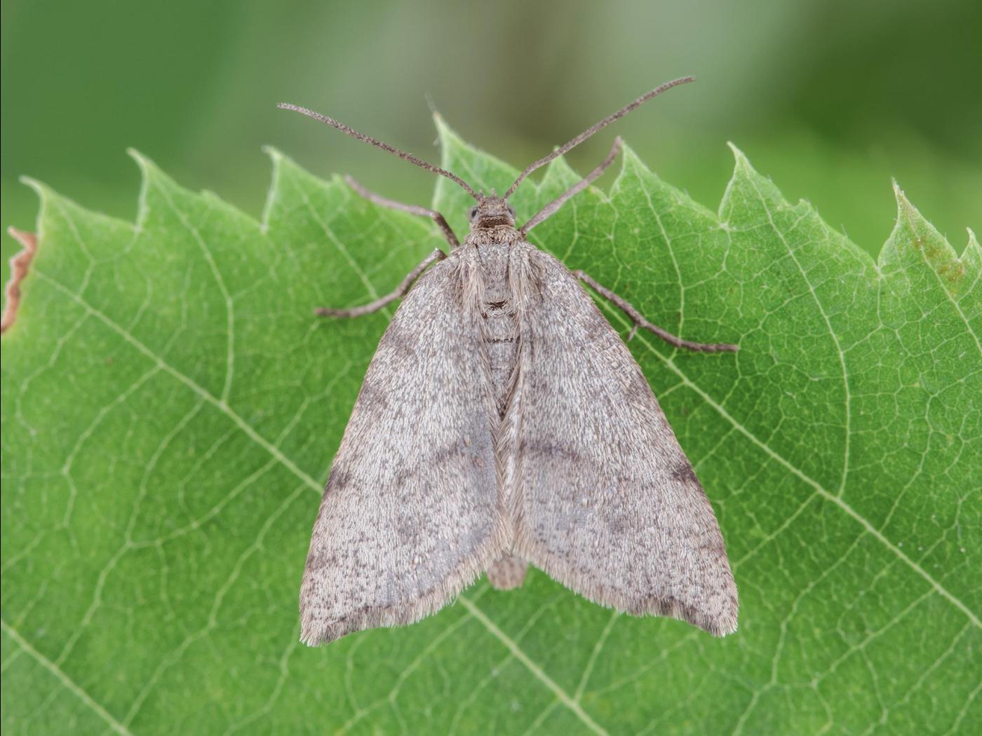 Adulte : chez la femelle, l’envergure des ailes est de 18,0 à 21,0 mm; les ailes antérieures sont beiges avec quelques taches brunes au niveau de la marge antérieure; les ailes postérieures sont blanchâtres; chez le mâle, l’envergure des ailes est de 25,0 à 27,0 mm; elles sont immaculées, gris ardoise, et la marge des ailes antérieures présente une bande foncée.