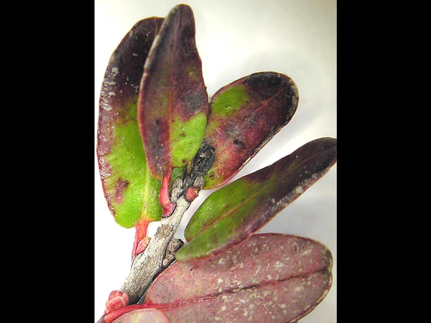 Description: Apex d'une nouvelle pousse de canneberge sur laquelle on observe le dommage d'alimentation d'une larve de la cécidomyie des atocas. Les larves brisent le point de croissance de la tige ce qui entraîne l'avortement du bourgeon terminal, forçant la plante à produire des tiges latérales. Les feuilles endommagées se courbent, forment une coupe, se décolorent, brunissent et tombent.