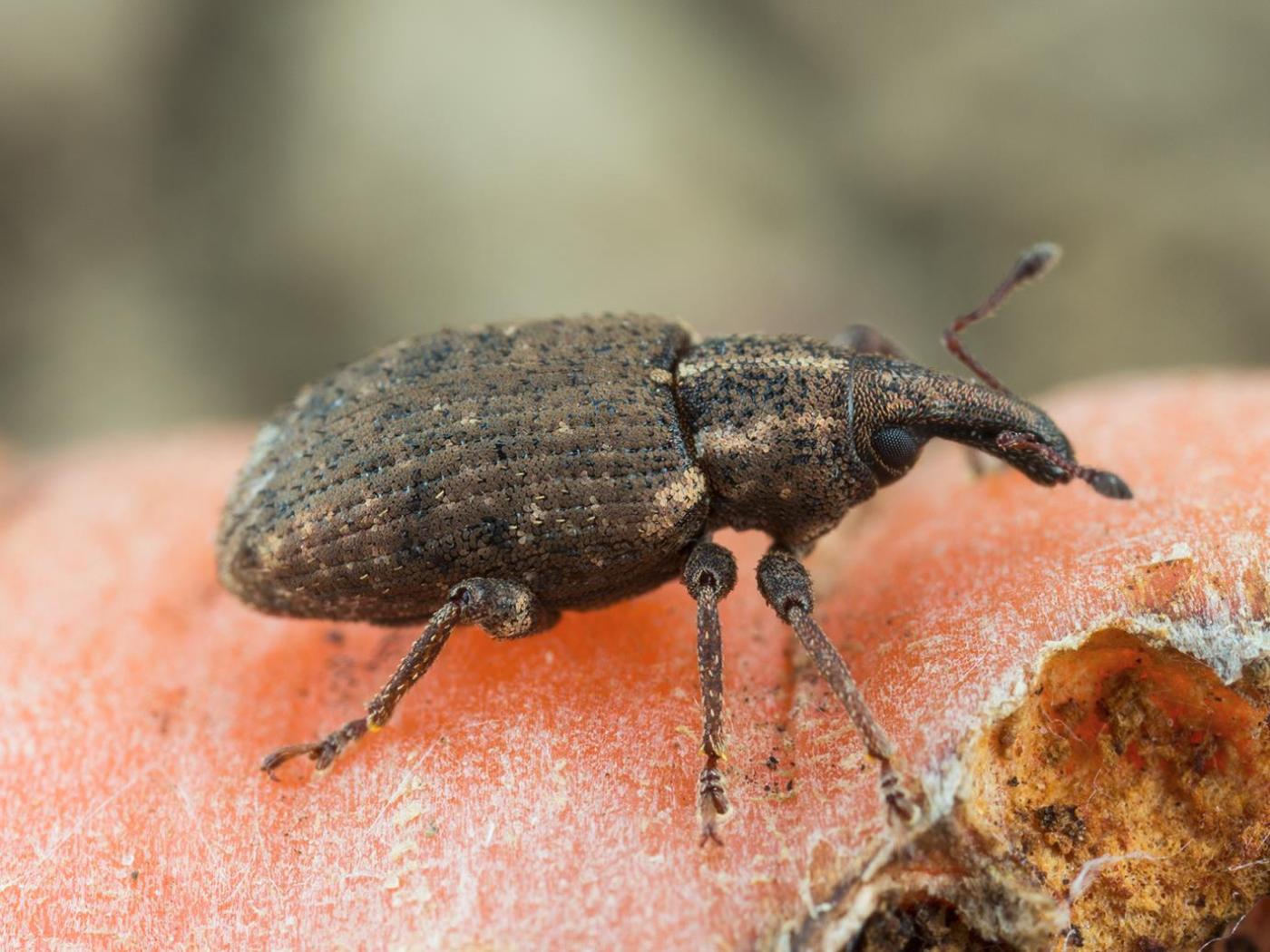 Adulte : 6,0 à 7,0 mm; le corps est noir, mais il est complètement recouvert de minuscules écailles brun foncé et de quelques écailles beiges; les élytres sont fortement striés et parsemés de petites soies dressées sur les interstries; trois lignes pâles sont présentes sur le thorax et une tache pâle est aussi présente au niveau de l'épaule (humérus); le rostre est très long.