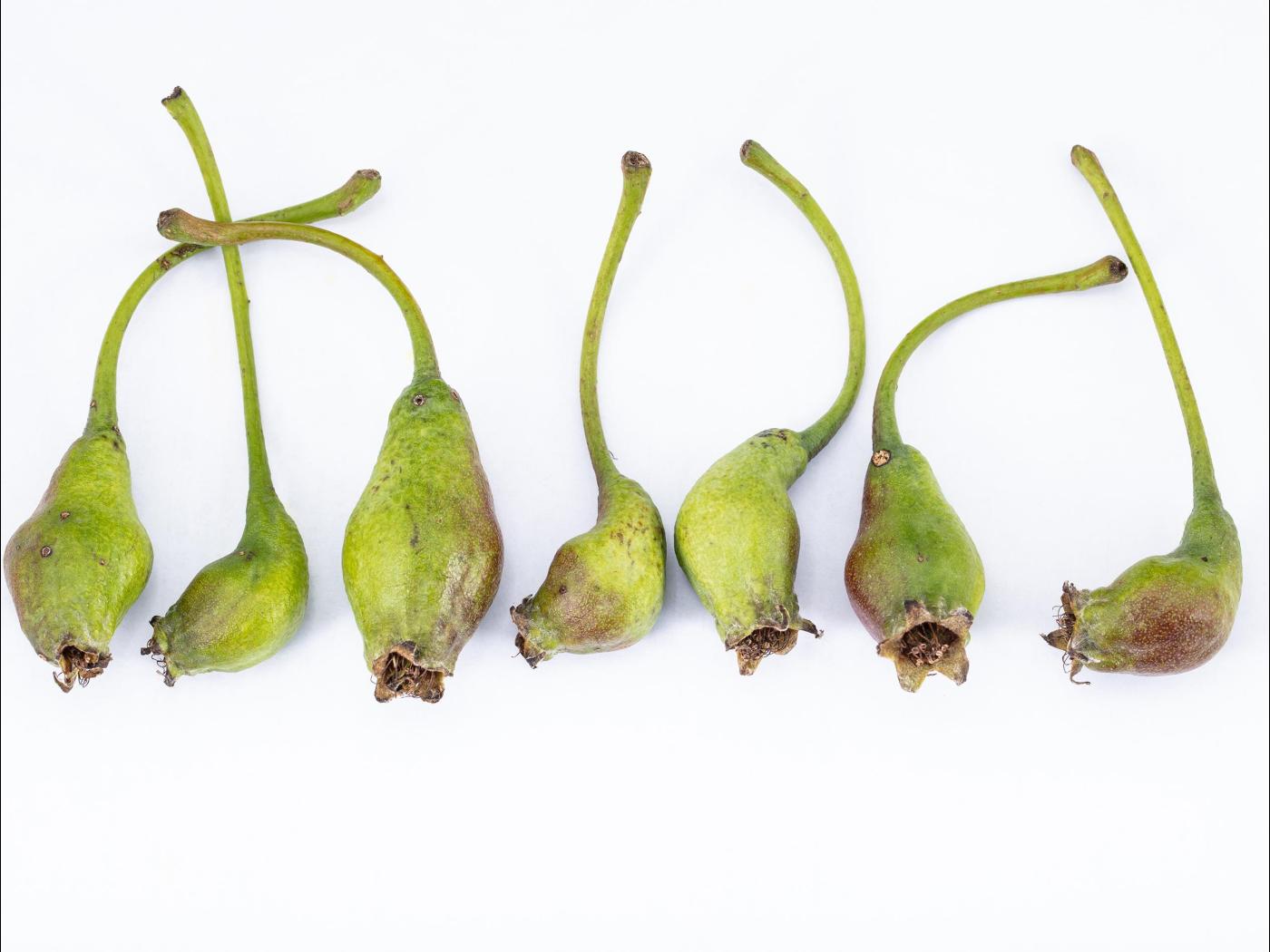 Légende: Poires déformées par l'action du charançon de la pomme.