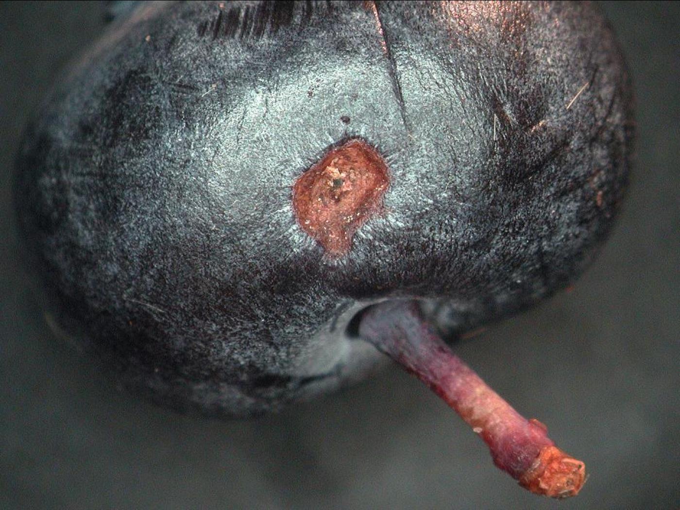 Description: Bleuet présentant un dégât d'alimentation d'un adulte de charançon de la prune. La forme du dégât est plus arrondie que la cicatrice de ponte qui est en forme de croissant. Ce type de dommage s'observe sur les fruits mûrs (à l'automne) alors que les cicatrices de ponte s'observent surtout sur les fruits verts.