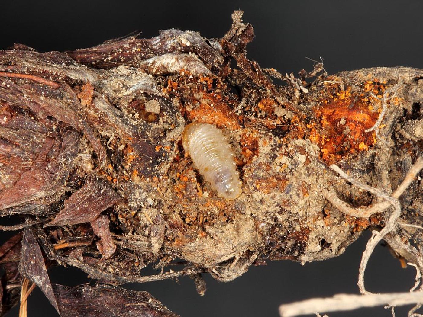 Larve : 10,0 mm à maturité; la tête est brune; le corps est blanc crème, en forme de croissant et porte des soies blanches dont la base est brune; ne possède pas de pattes.