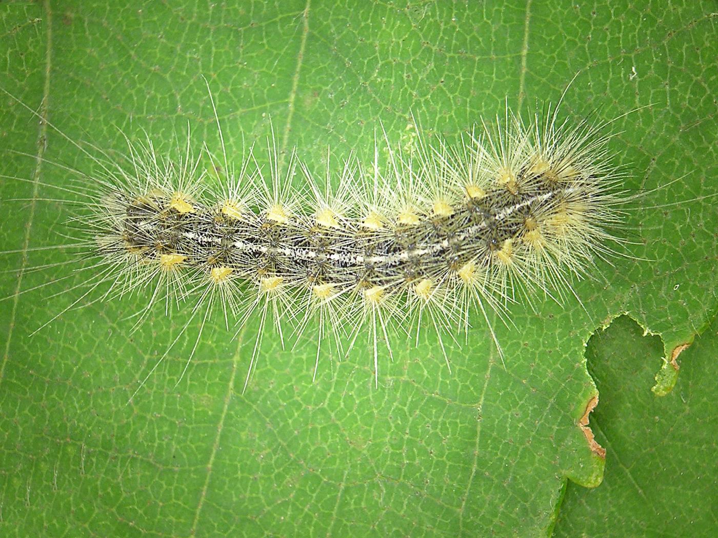 Larve : 26,0 mm à maturité; la jeune larve est de couleur jaunâtre avec de multiples tubercules noirs surmontés de quelques poils; la larve mature est jaune pâle sur les côtés et foncé sur le dos; les tubercules sont noirs sur le dos et orangés sur les côtés; les tubercules supportent de longues touffes de poils blancs et noirs.