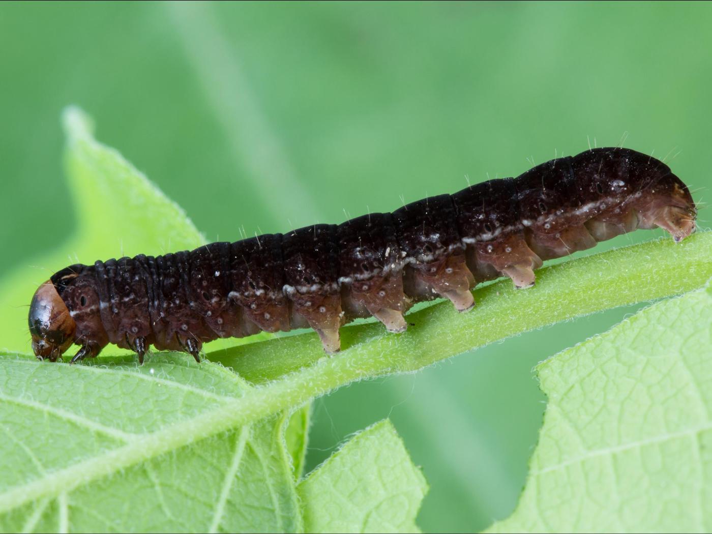 Larve : 35,0 mm à maturité; chez la jeune larve (stades 1 à 4), la tête est brun orangé et luisante et le corps est rouge ou rouge et vert et est traversé de lignes dorsales et latérales blanches; chez la larve mature (stades 5 et 6), la tête est brune et noire tandis que le corps est brun pourpre velouté avec de fines lignes dorsales et latérales blanches.