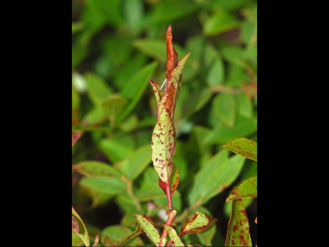 Tige de bleuet présentant des dommages causés par des larves de la tordeuse du bleuet. Cette espèce grignote la surface des feuilles entre les nervures. Les larves se forment un abri composé de feuilles squelettisées brunes et desséchées à l'aide de toiles tissées. L'abri s'agrandit progressivement à mesure que la larve se nourrit et croît. Les plants endommagés sont visibles de la mi-août jusqu'à la fin de l'automne.