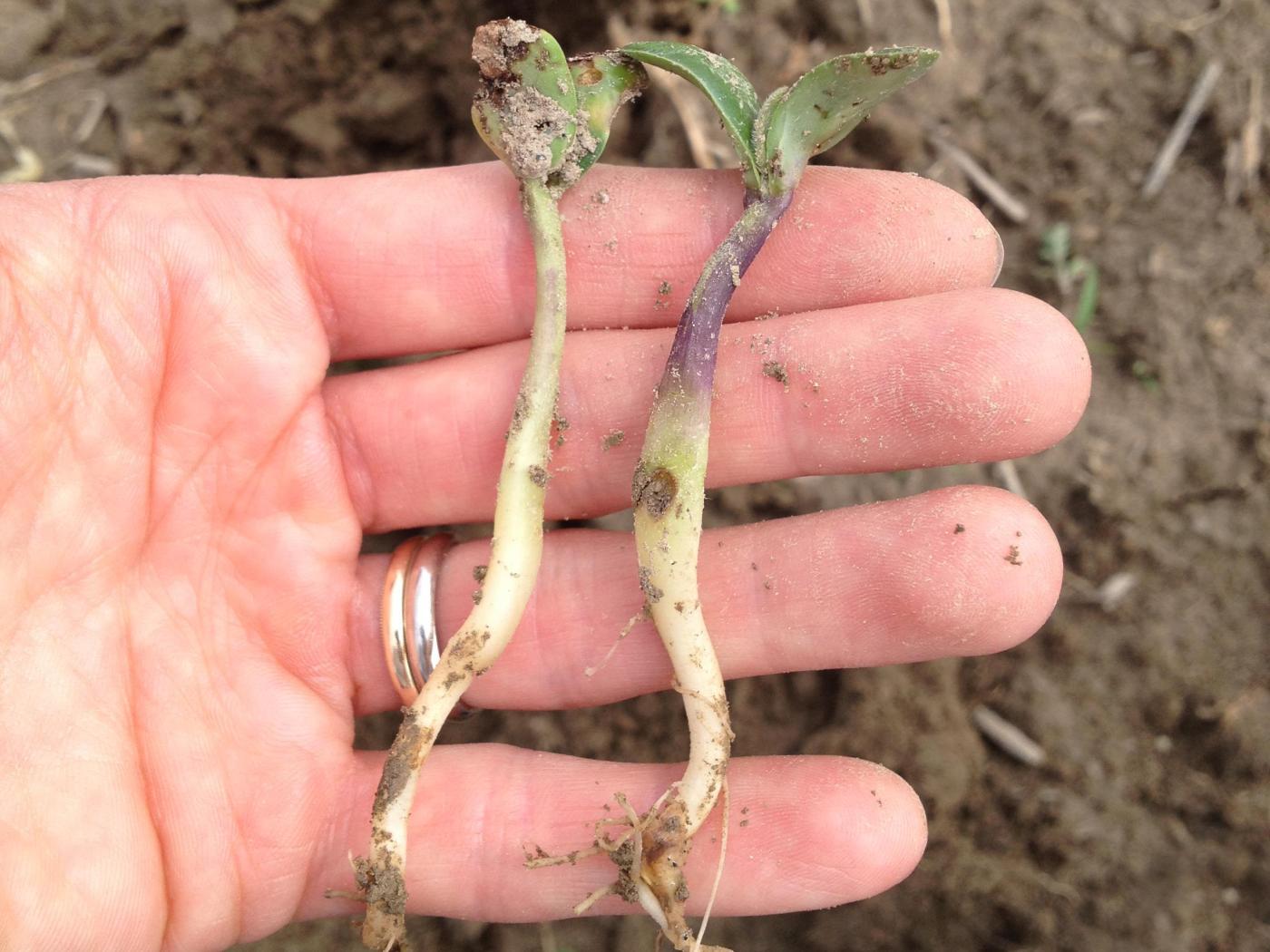 Légende: Dommages causés par la mouche des semis sur des plantules de soya