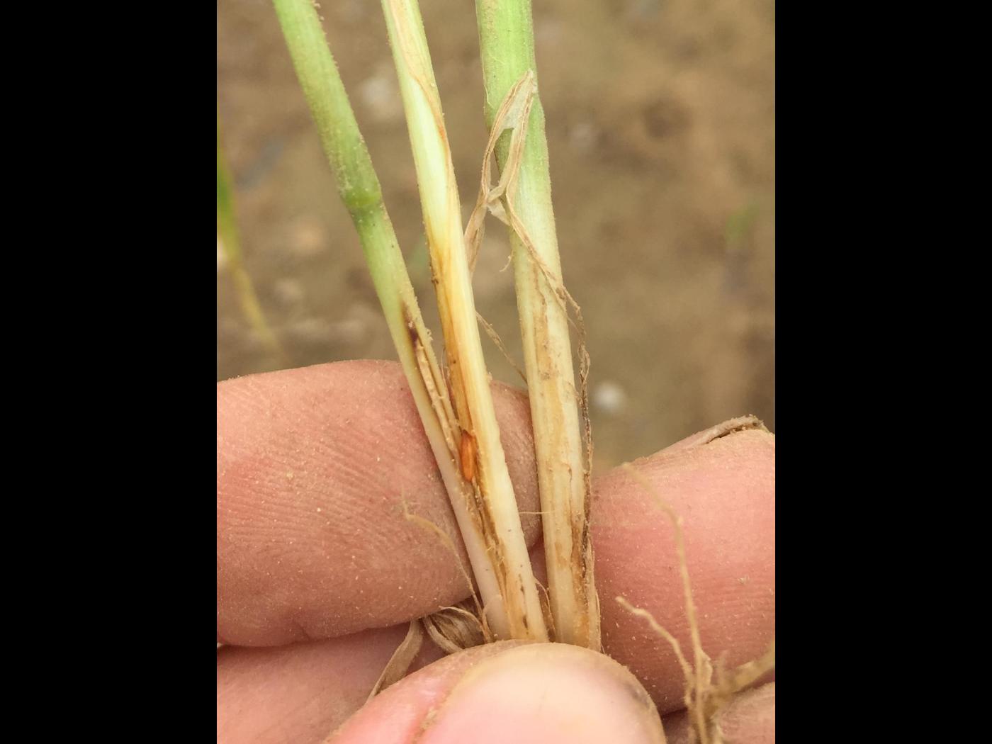 Description: Dommages causés par le développement de la larve d'Oscinella pusilla sur une tige de blé de printemps. On observe le fendillement longitudinal à la base de la tige ainsi que la présence de la pupe d'O. pusilla. Les tiges attaquées se dessèchent et ne sont pas en mesure de produire des épis.