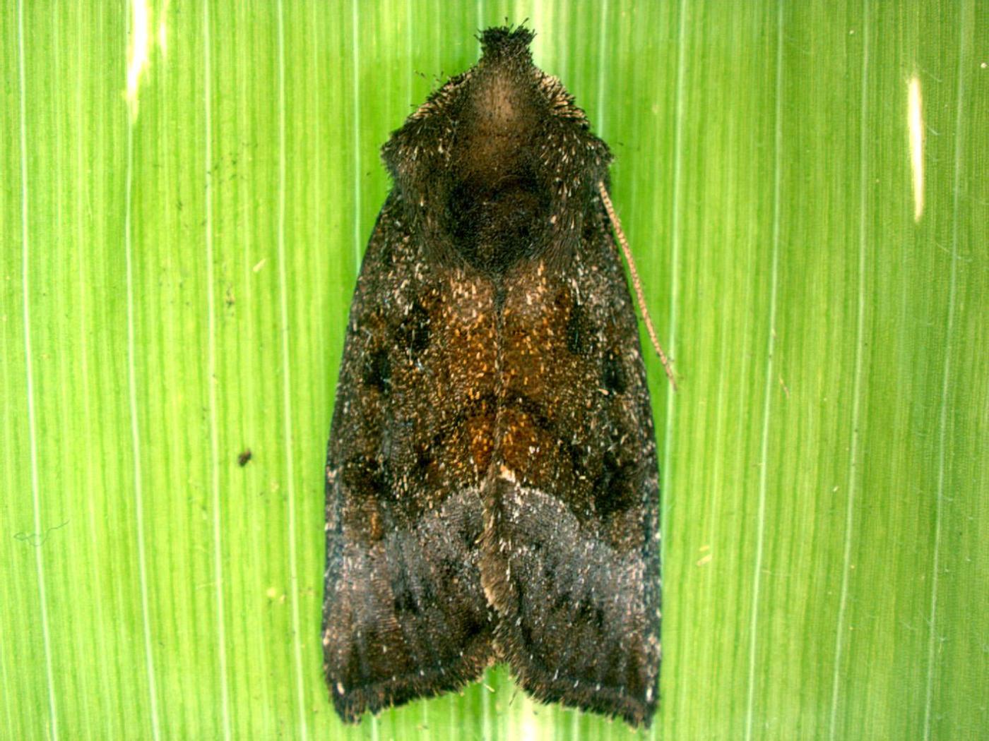 Adulte : envergure des ailes de 25,0 à 40,0 mm; la tête et le thorax sont ornés de soies dressées; les ailes sont brun foncé avec des taches noires ou blanches dans la portion centrale; l’extrémité apicale des ailes antérieures est gris cendré.