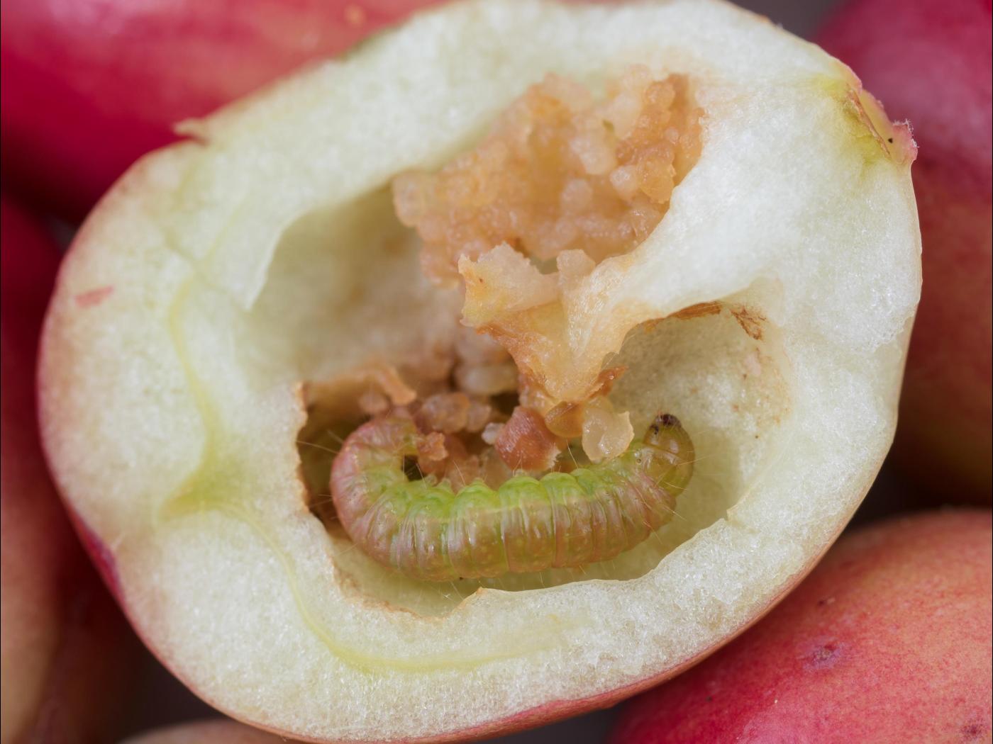 Une génération par année. Hiberne au stade de prépupe et se transforme en pupe le printemps suivant. L'adulte est présent de juin à août et est actif la nuit. La femelle pond environ 50 oeufs au courant de sa vie. Chaque oeuf est déposé individuellement sur un fruit. Développement larvaire de juillet à septembre. Après l'éclosion, la jeune larve creuse un trou, pénètre dans le fruit et scelle le trou d'entrée derrière elle à l'aide de soie. Lorsque l'intérieur du fruit est consommé, la larve sort et trouve un autre fruit. Une seule larve peut attaquer de trois à six fruits au courant de son développement. À maturité, les larves se laissent tomber au sol et fabriquent une cellule de soie recouverte de sable. C'est le principal ravageur de la canneberge.