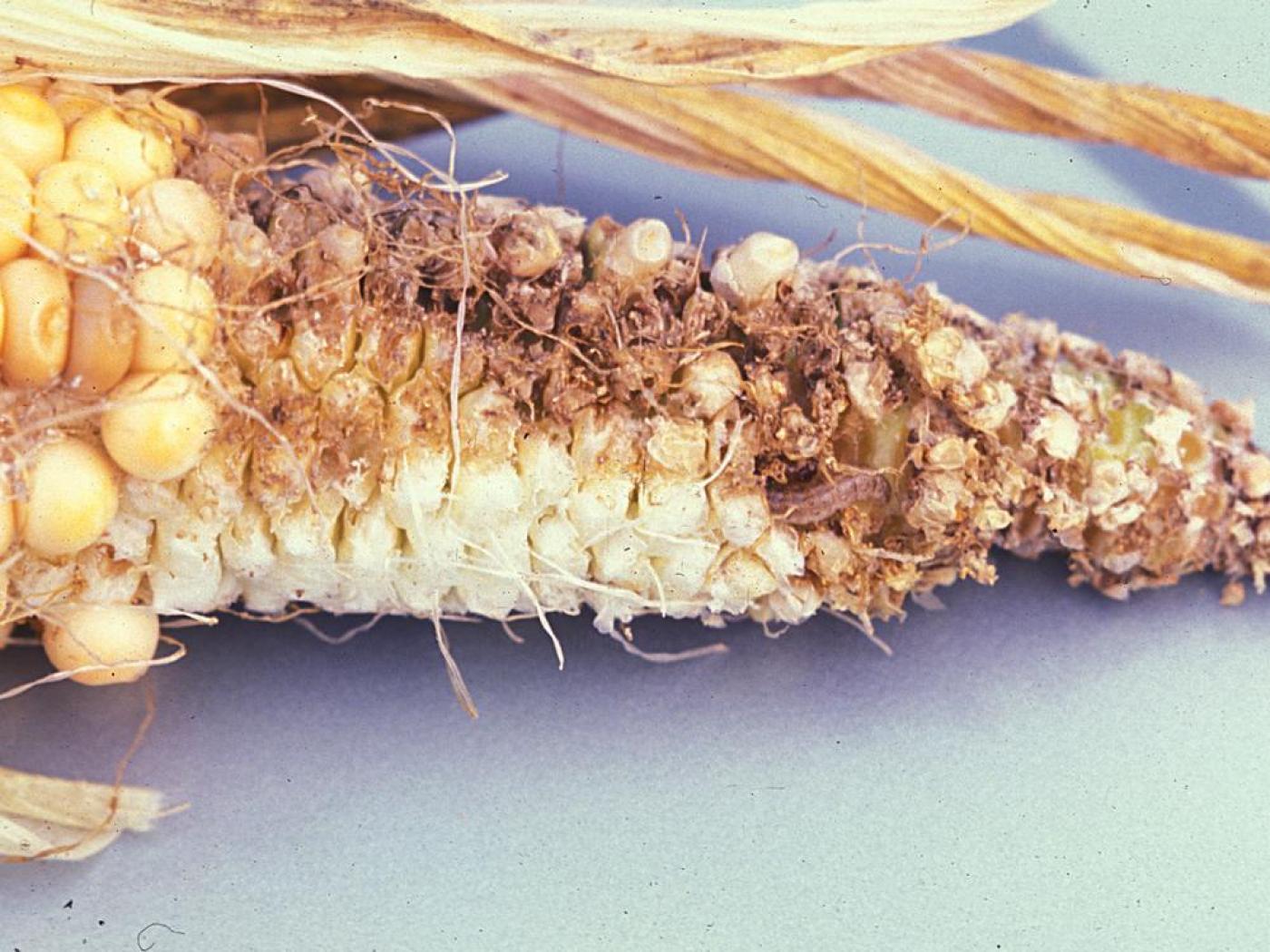 Description: Dommage de la pyrale du maïs sur un épi de maïs : cette espèce est un ravageur important dans le maïs alors que les larves s’attaquent à toutes les parties aériennes du plant. Les jeunes larves se nourrissent sur le feuillage, ce qui engendre de petits trous en tête d’épingle (criblures). Elles migrent ensuite au fond du cornet pour s’attaquer à la panicule en émergence, cassant parfois la base de celle-ci. Les larves peuvent également s’attaquer directement aux grains en formation.