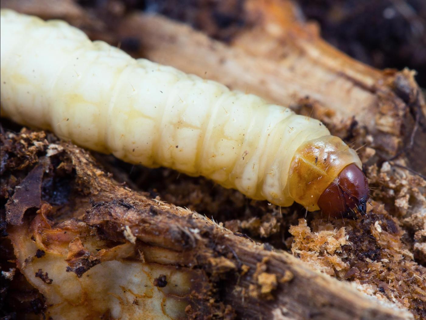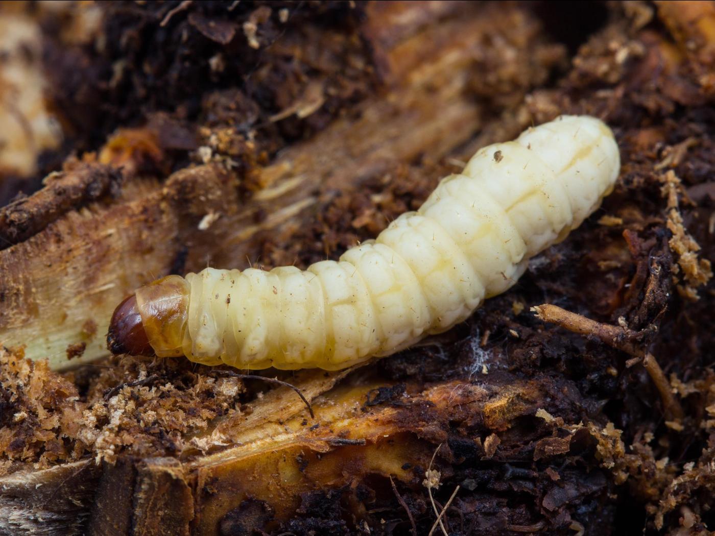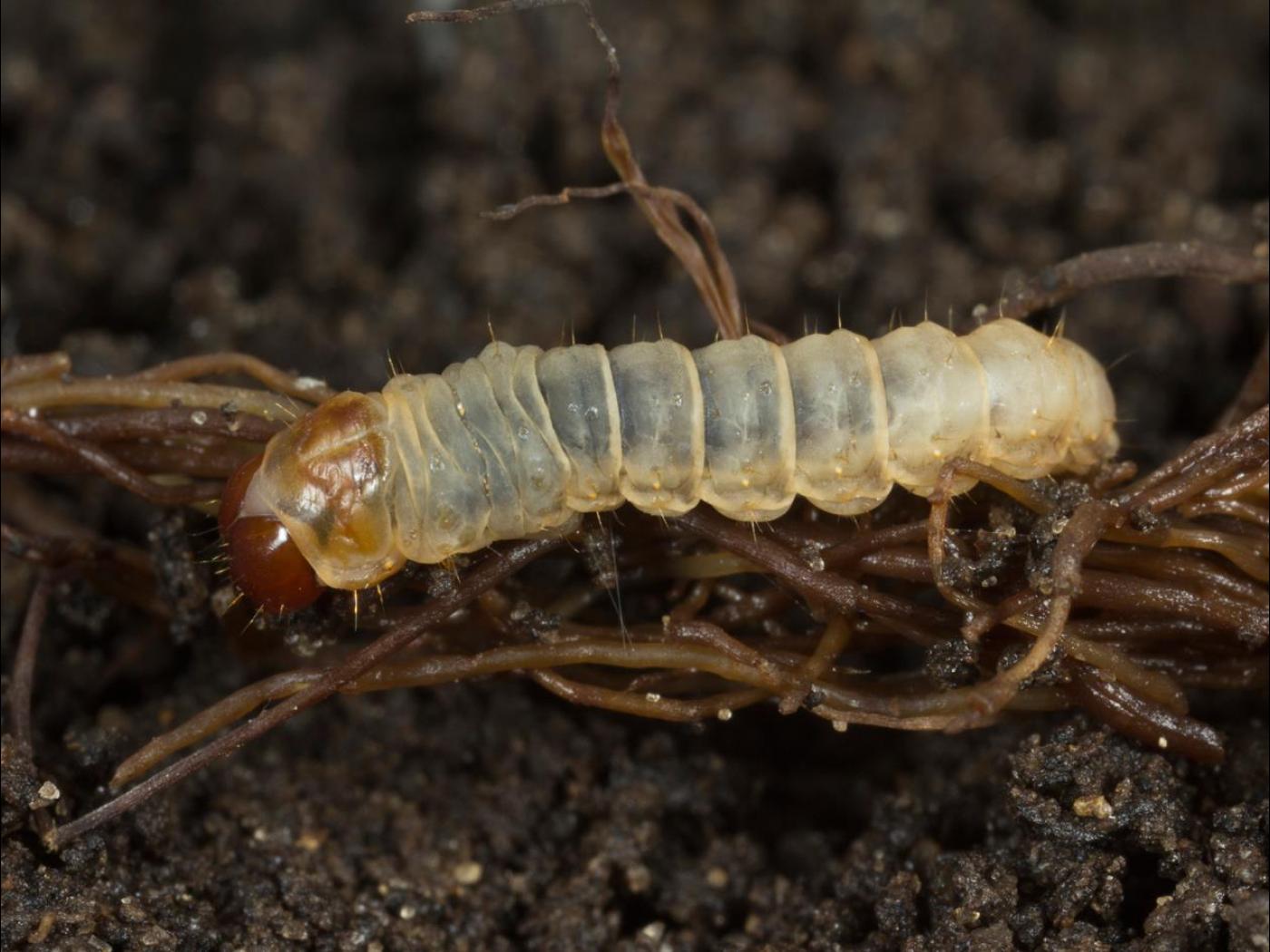 Larve : 25,0 à 33,0 mm à maturité; la tête est brune et aplatie dorso-ventralement; le corps est de couleur blanc crème; les fausses-pattes sont très courtes; les crochets des fausses pattes sont disposés transversalement en forme d'ellipse.