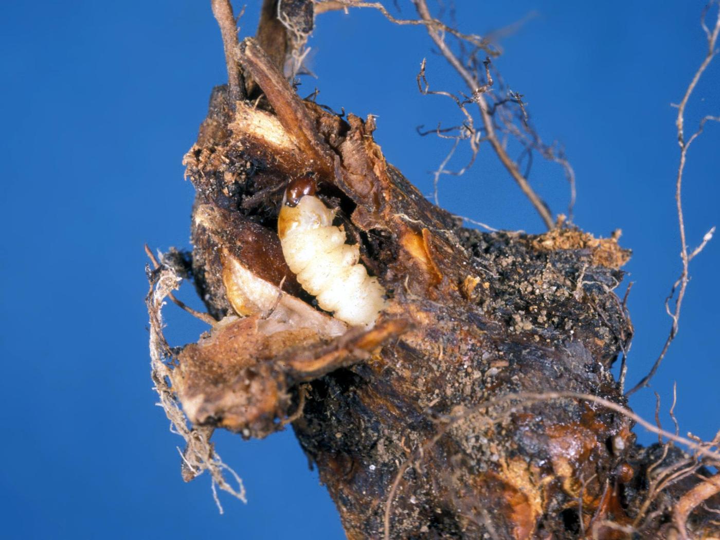 Lorsqu'une larve se développe dans le collet d'un framboisier, le feuillage et les tiges se dessèchent. Les dommages sont plus importants lorsque la larve est à sa deuxième année de développement. On observe alors un renflement à la base des tiges et au collet suivi d'un dépérissement du plant entier.