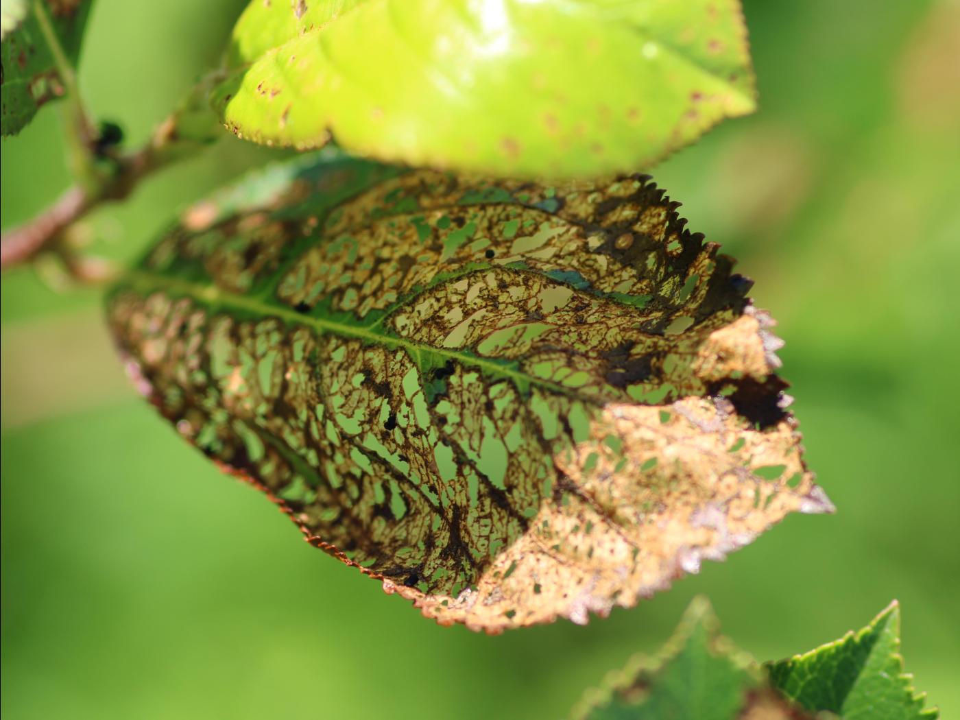 Description: Dommages typiques d’une feuille d’aronia squelettisée à la suite du passage de scarabées japonais adultes. Les fruits peuvent être grignotés si la population de l’insecte est très forte.