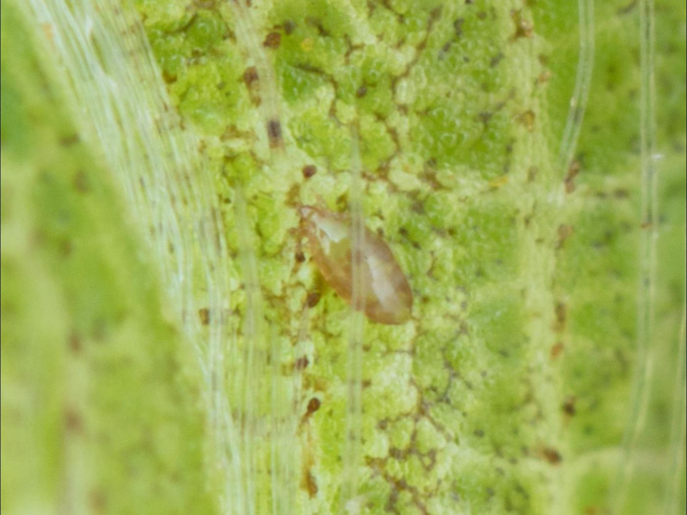 Adulte : 0,25 mm; le corps est ovale et de couleur beige; les pattes arrière de la femelle sont atrophiées tandis que celles du mâle sont très robustes.