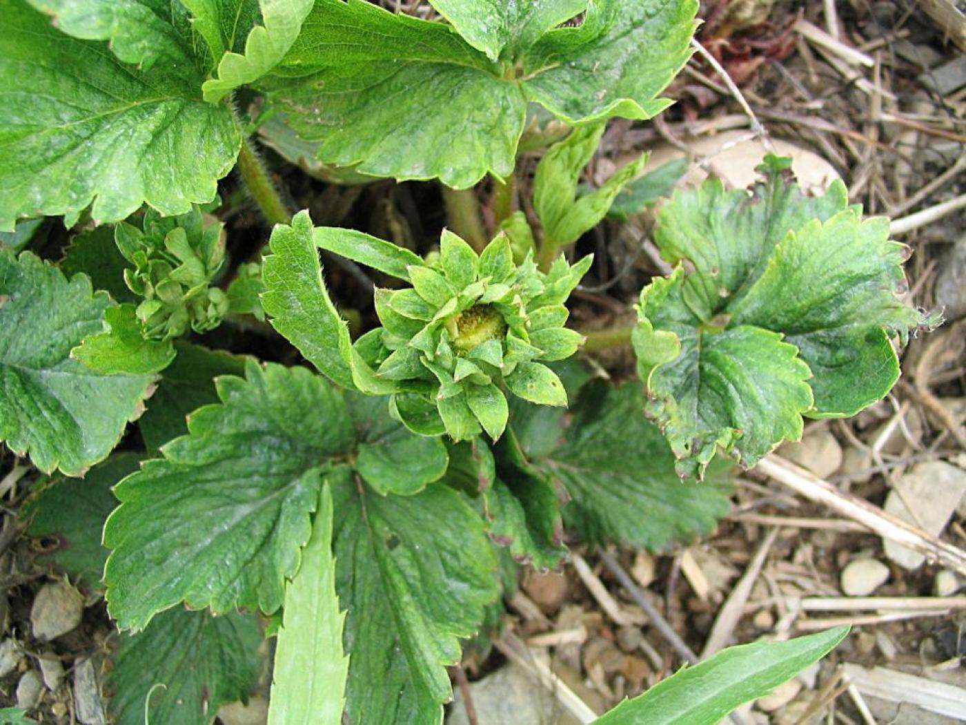 Description: Feuillages de fraisier présentant des dommages causés par l'alimentation de tarsonèmes du fraisier. Ces acariens s'attaquent d'abord aux jeunes feuilles au coeur du plant. En plus d'induire un retard de croissance, les feuilles deviennent crispées, recroquevillées et d'aspect terne, jauni ou rougeâtre. Il en découle parfois un stress diminuant la productivité des plants ou augmentant leur sensibilité aux stress hydriques.