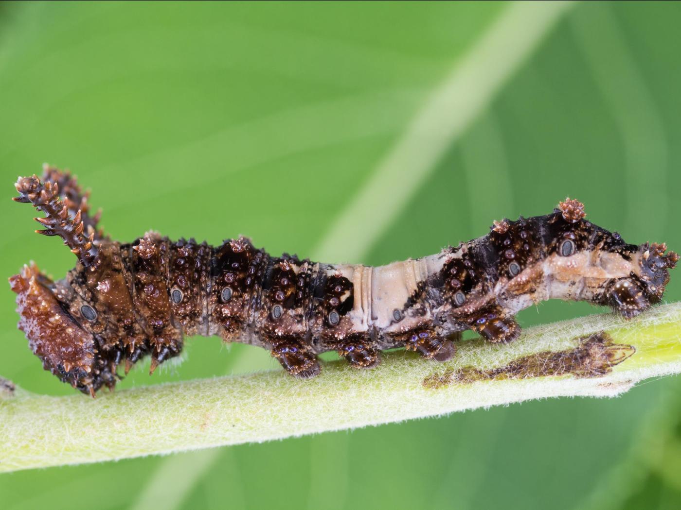 Larve : jusqu’à 50,0 mm à maturité; la tête est brun foncé et est recouverte de nombreuses protubérances pointues; le reste du corps est brun et une tache blanc crème est présente sur le dessus des quatrième et cinquième segments abdominaux; deux protubérances épineuses sont présentes sur le deuxième segment thoracique.