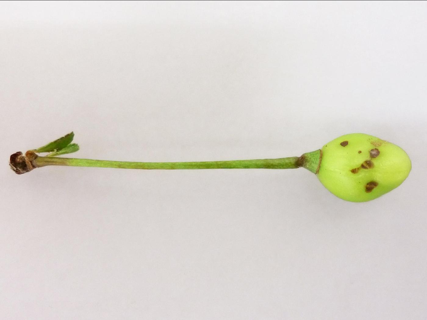 Légende: Tache causée par la coulure bactérienne sur le fruit d'un cerisier nain rustique.