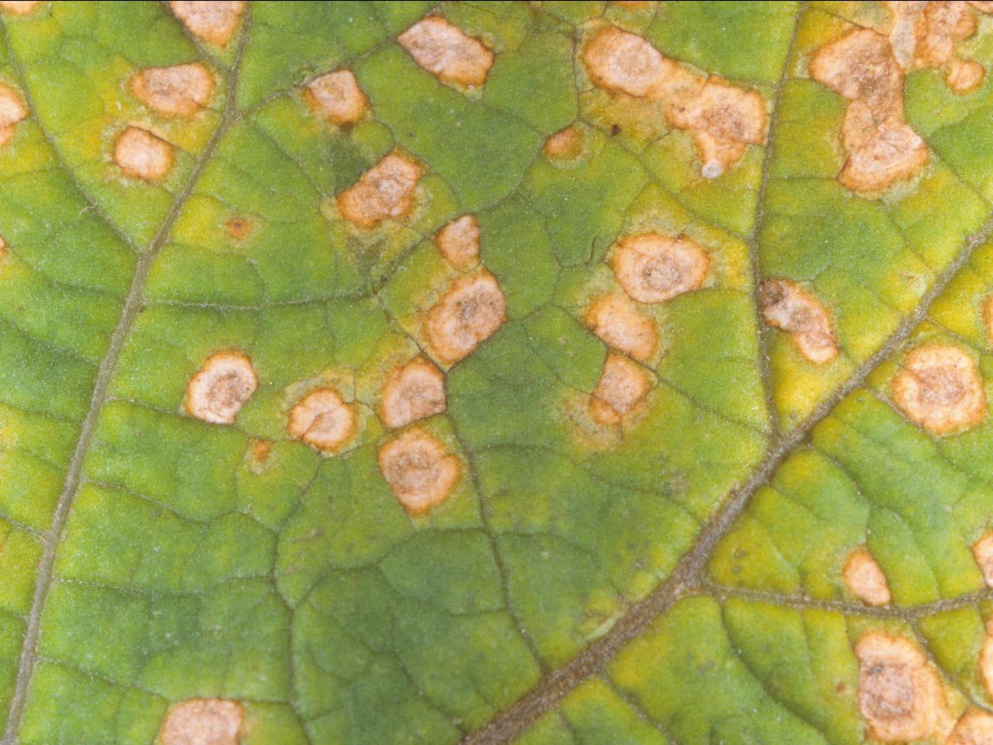 Feuille : présence de petites taches circulaires à irrégulières beige au centre et bordées d’une marge brun foncé. Un halo jaune est parfois présent. En vieillissant, les taches deviennent grisâtres et se regroupent. Des fructifications noires du champignon sont parfois visibles au centre des taches.