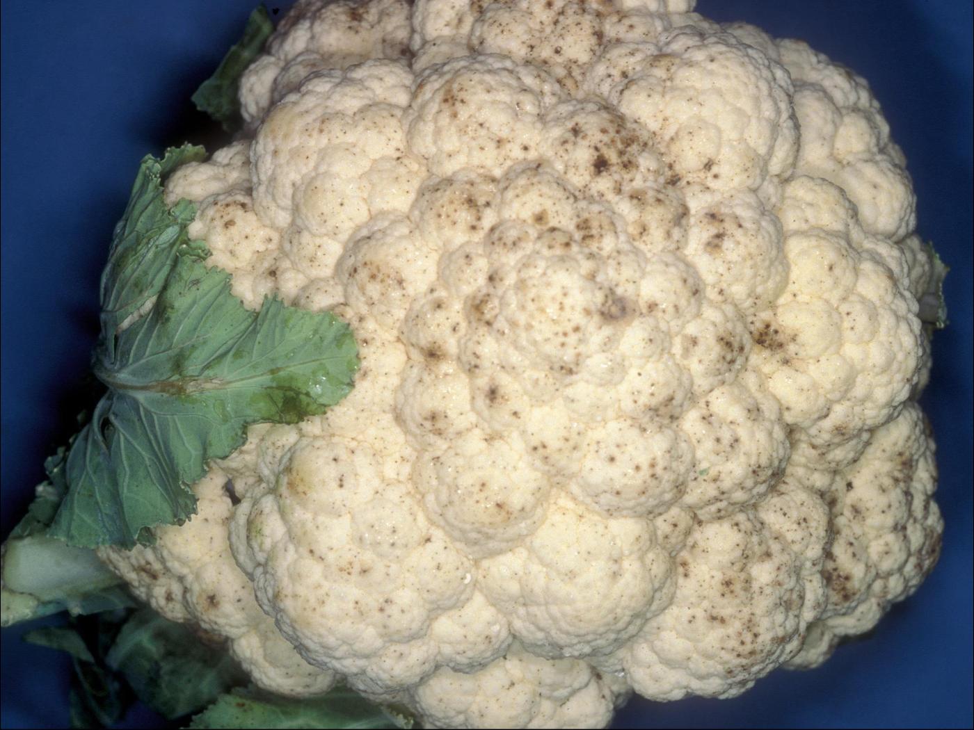 Fleur : présence de petites taches brunes et rondes sur le pédicelle et le calice. Elles peuvent se rabougrir et tomber. Sur les inflorescences du brocoli et du chou-fleur, brunissement des fleurons débutant à la marge. Avec le développement de la maladie, le brunissement de l’inflorescence demeure superficiel et il est partiel ou total.