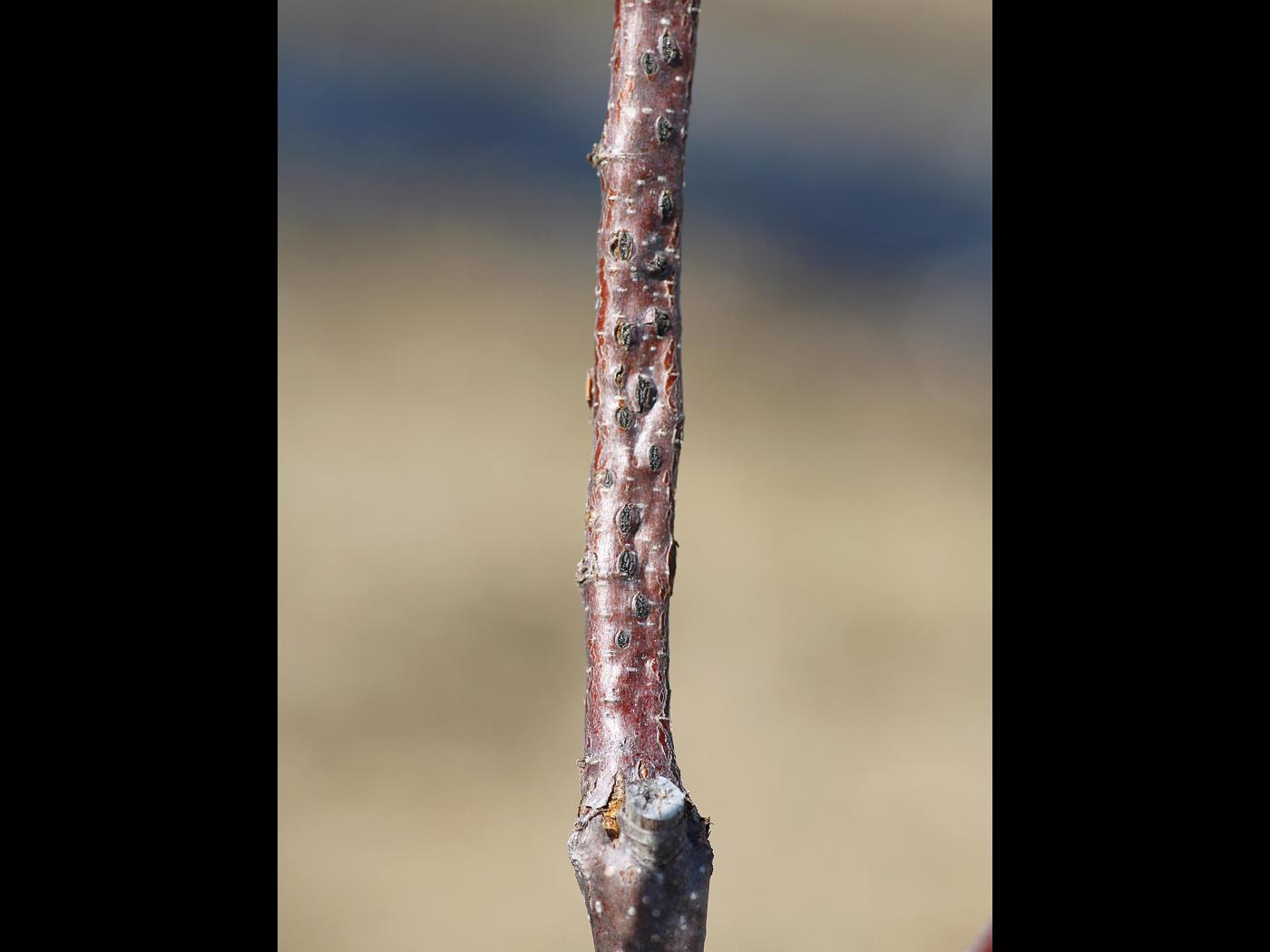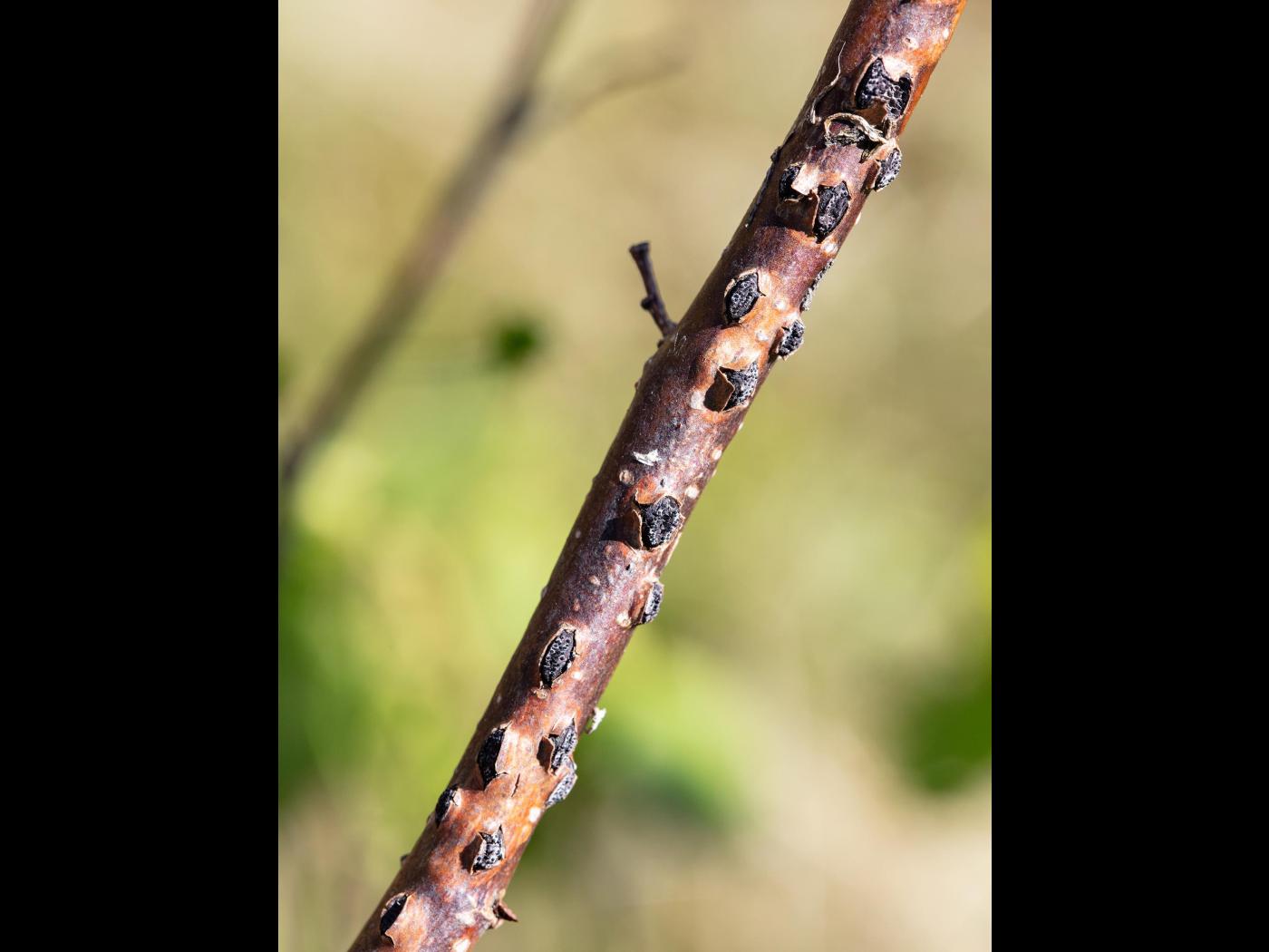 Tige : Le premier symptôme correspond à la formation de chancres sur les branches et les rameaux. Ils n’apparaissent que 12 à 16 mois suivant l’infection et sont causés par la croissance du mycélium dans le cambium et le phloème. L’écorce dans les zones infectées s'affaisse et brunit, et un chancre se développe. Par la suite, des rangées de stromata noirs et elliptiques (1,5-3,0 x 2-10 x 1-2 mm) se forment sur les chancres allongés selon un motif assez régulier. Il s’agit d’un signe fongique typique de l’infection. De nouveaux stromata se développent au fur et à mesure que le chancre s'étend le long et autour de la branche. Lorsque le chancre ceinture la branche ou le tronc, le bois au-dessus de la lésion meurt.